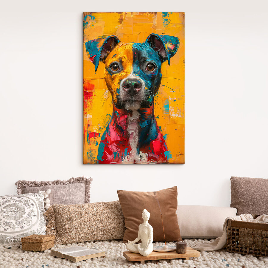 Wenn Ihr Raum eine Aufmunterung oder einen Gesprächsanreiz braucht, ist dieser Druck genau das Richtige für Sie. Die kräftigen Farben – Rot, Blau, Gelb – tanzen miteinander und bringen den verspielten Geist des Hundes zum Ausdruck. Perfekt für Tierliebhaber, Kunstbegeisterte oder alle, die einfach nur einen kleinen zusätzlichen Funken Freude in ihrem Zuhause brauchen. Es ist ein Stück, das nicht nur an der Wand hängt – es wird Teil deines Tages, deiner Geschichte.