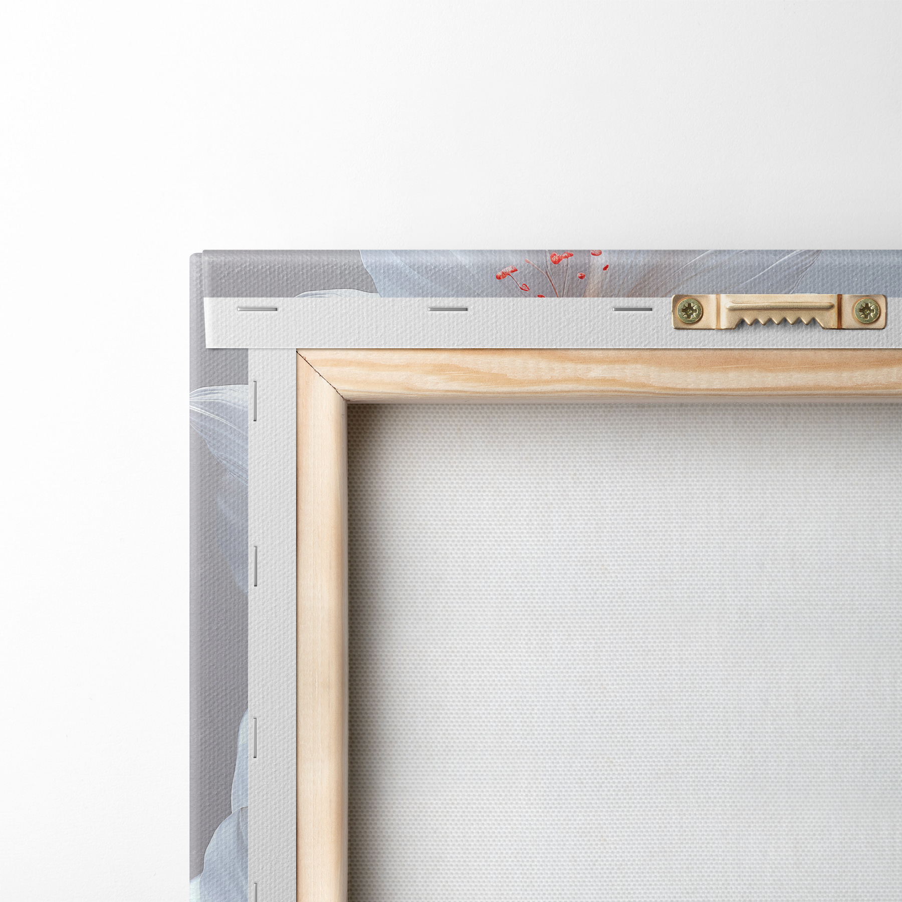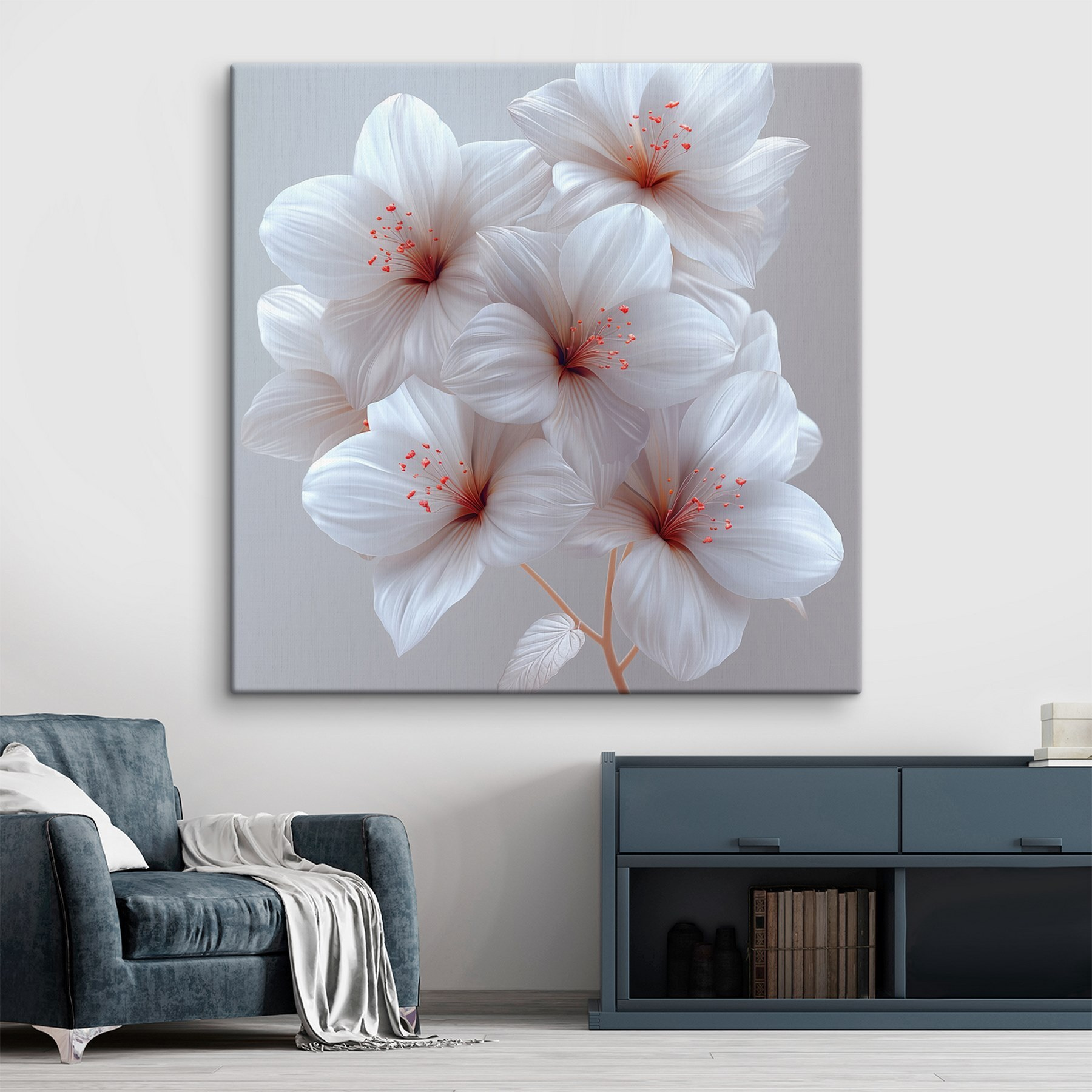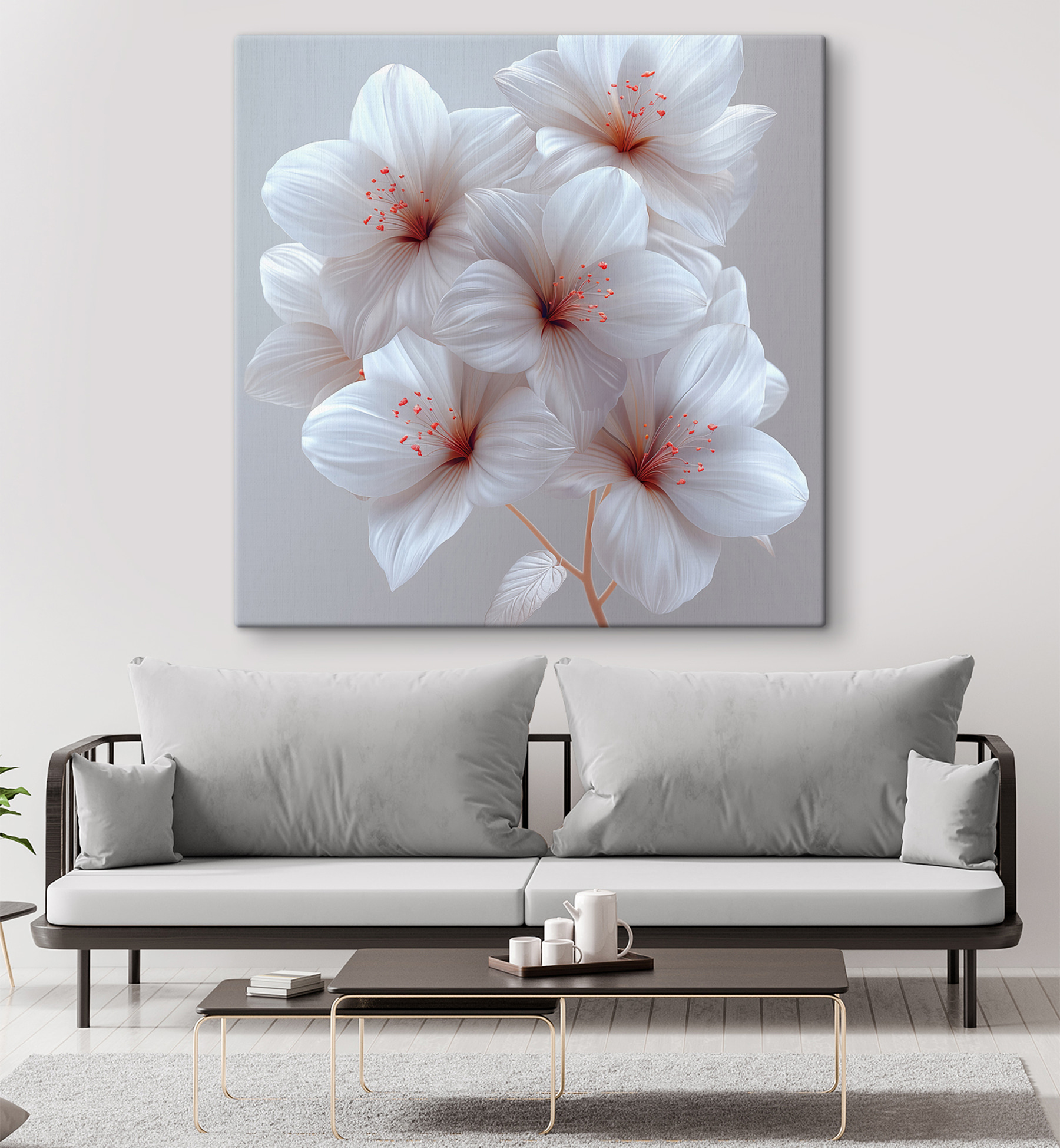 Die sanften Farbtöne der Blütenblätter und die kleinen korallenroten Farbtupfer an den Staubgefäßen wirken so beruhigend, fast wie eine visuelle Umarmung. Perfekt für jeden Raum, der einen Hauch von Ruhe und Schönheit braucht. Stellen Sie sie in Ihre Leseecke oder an den Platz in Ihrem Schlafzimmer, an dem Sie Ihren Morgenkaffee genießen. Es ist ein Bild, das zum Träumen von sonnigen Gärten und sanften Brisen einlädt. Dieser Druck ist mehr als nur Dekoration – er ist eine Erinnerung an die Eleganz und Einfachheit der Natur, direkt in Ihrem Zuhause.