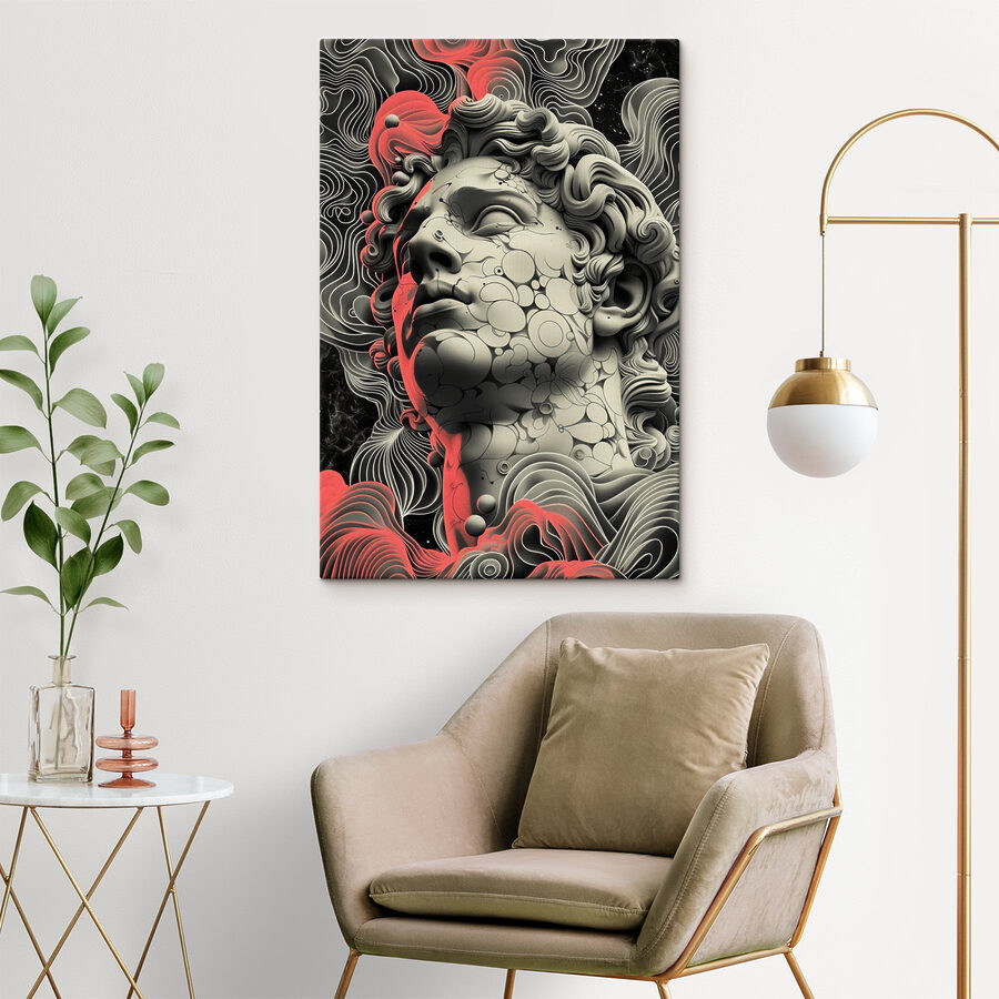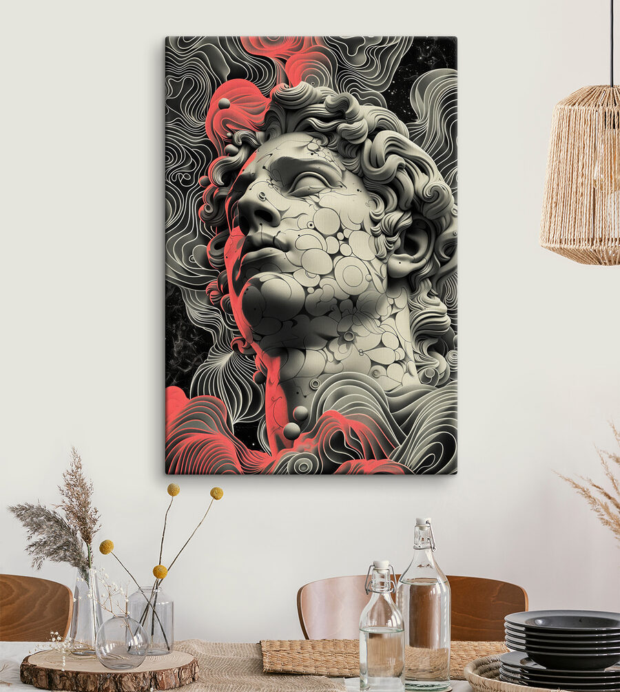 Stellen Sie sich ein auffälliges Werk vor, das mühelos die Blicke auf sich zieht und die Fantasie anregt. Dieser Leinwanddruck mit der Statue eines Mannes ist nicht nur Kunst, sondern auch ein Gesprächsanlass. Mit kühnen Wirbeln und weichen Kurven, die um eine klassische Figur herum tanzen, schafft es einen faszinierenden Kontrast, der alte Geschichten erzählt und gleichzeitig frisch und modern wirkt.