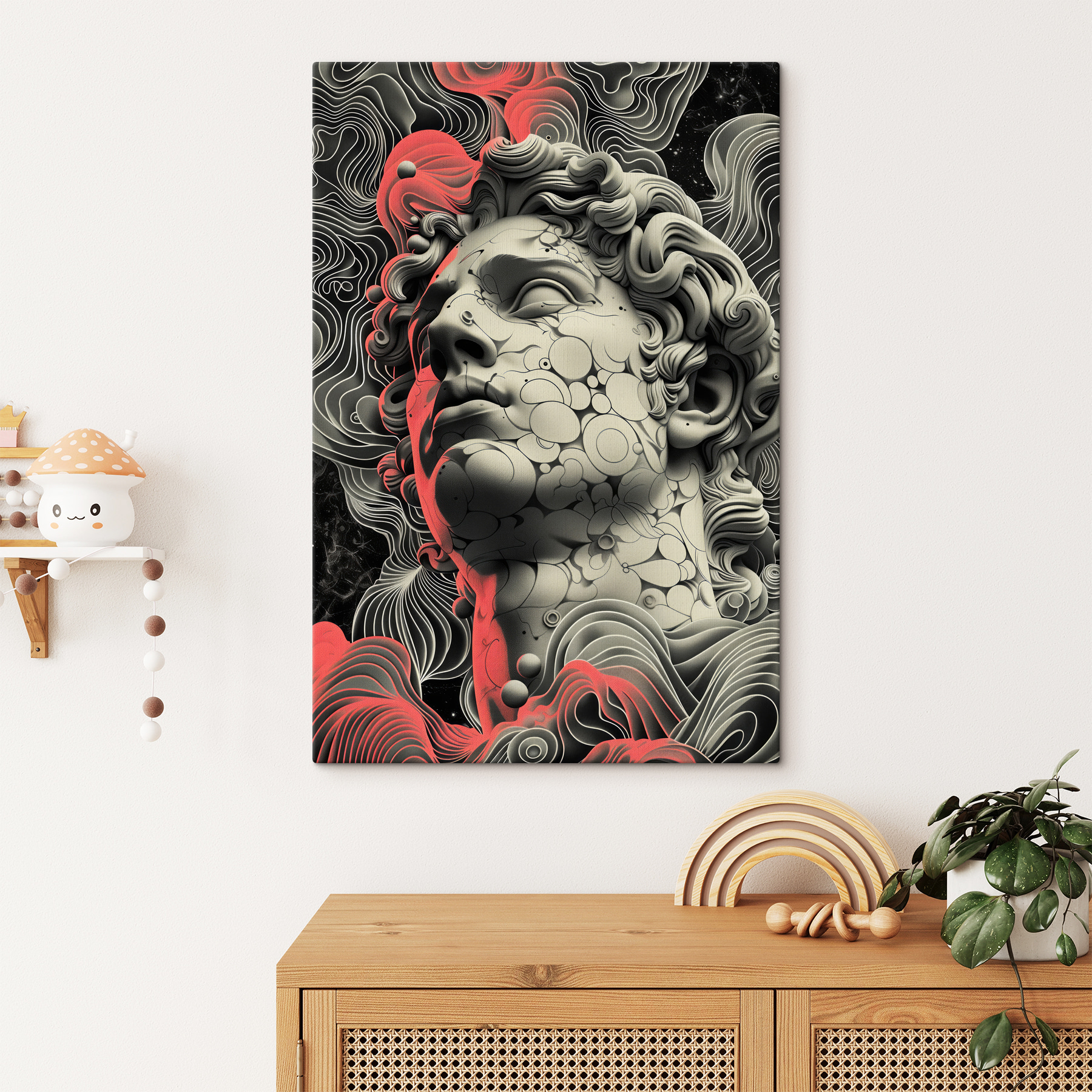 Stellen Sie sich ein auffälliges Werk vor, das mühelos die Blicke auf sich zieht und die Fantasie anregt. Dieser Leinwanddruck mit der Statue eines Mannes ist nicht nur Kunst, sondern auch ein Gesprächsanlass. Mit kühnen Wirbeln und weichen Kurven, die um eine klassische Figur herum tanzen, schafft es einen faszinierenden Kontrast, der alte Geschichten erzählt und gleichzeitig frisch und modern wirkt.