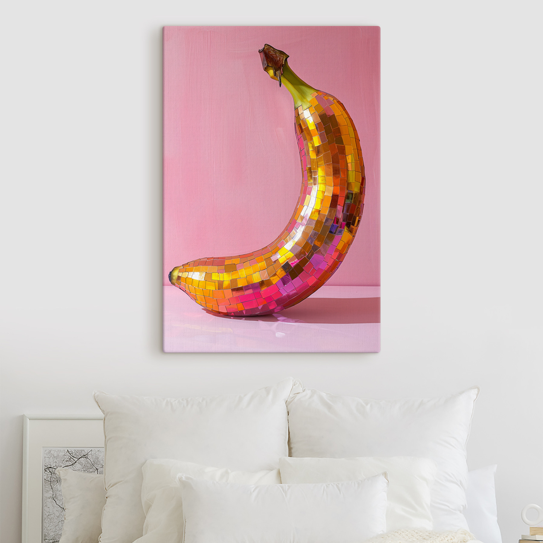 Lernen Sie die entzückende “Bunte Spiegel-Banane” kennen. Dieser auffällige Leinwanddruck ist nicht nur Kunst, sondern auch ein Gesprächsanlass. Mit seinem verspielten Design vor einem zartrosa Hintergrund bringt es einen Hauch von Laune in jeden Raum. Stellen Sie sich vor, Sie betreten Ihren Raum und werden von dieser lebhaften Banane begrüßt, deren glänzende Mosaiksteine wie eine kleine Disco-Party schimmern. Sie ist perfekt für alle, die Spaß und Stil miteinander verbinden möchten. Egal, ob sie in einer gemütlichen Küche oder einem hellen Wohnzimmer hängt, sie zaubert ein Lächeln und einen Hauch von Persönlichkeit. Wer hätte gedacht, dass eine Banane so schick sein kann? Perfekt, um das tägliche Leben zu erhellen!