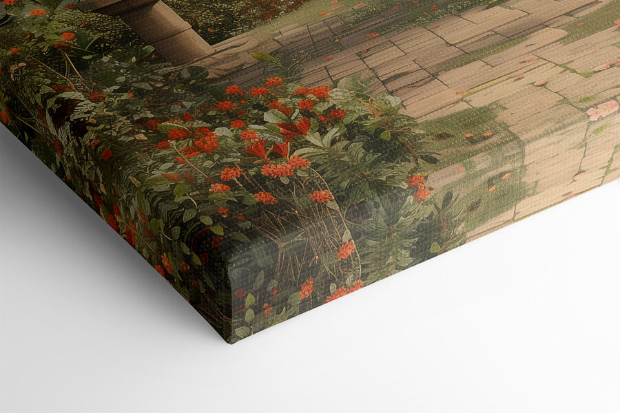 Jedes Mal, wenn Sie das Bild betrachten, werden Sie sich fühlen, als hätten Sie einen tiefen Atemzug frischer Luft genommen – die Art, die Ihren Geist klärt und Sie lächeln lässt. Die Details sind einfach wunderschön: Blüten in leuchtenden Farben, malerische traditionelle Architektur und ein verträumter Weg, der zu einem Spaziergang einlädt. Platzieren Sie es über Ihrer Couch oder vielleicht in Ihrem Schlafzimmer – überall dort, wo Sie ein wenig Ruhe brauchen. Außerdem ist es ein toller Gesprächsanlass. Freunde werden staunen, Sie werden sich wohlfühlen, und Ihr Raum erhält einen Hauch von Eleganz und Ruhe. Es ist mehr als nur Kunst – es ist ein Gefühl.