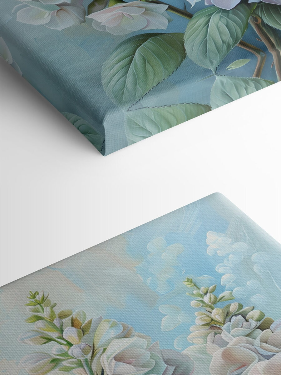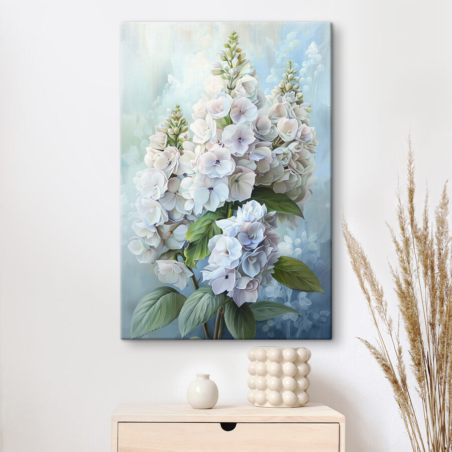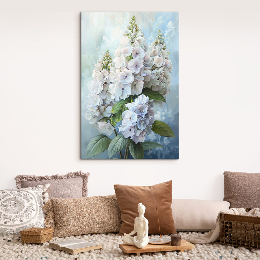 Man spürt förmlich das sanfte Rascheln der Blätter und die weichen Blütenblätter, die sich gegenseitig berühren. Die Farben sind beruhigend, mit sanftem Weiß und Grün, die in einem Tanz miteinander verschmelzen, der fast hypnotisch wirkt. Ideal für einen Wintergarten oder eine gemütliche Leseecke, in der man sich in ein gutes Buch vertiefen kann, umgeben von diesen friedlichen Blüten.