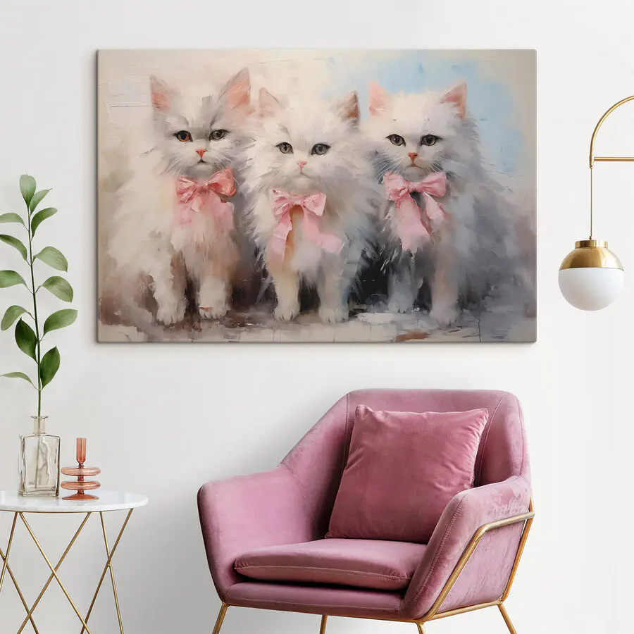 Stellen Sie sich vor – drei süße, flauschige Kätzchen, alle mit bezaubernden rosa Schleifen geschmückt, die direkt in Ihre Seele blicken. Das ist es, was Sie mit “Wandbilder s39826” bekommen! Dieses süße Katzentrio ist perfekt für Tierliebhaber und verleiht jeder Wand einen Hauch von Laune und Eleganz. Man kann sie fast schnurren hören. Freunde kommen herein und können sich ein Lächeln nicht verkneifen… ehrlich gesagt, es ist, als würden sie dich herausfordern, sie nicht zu lieben.
