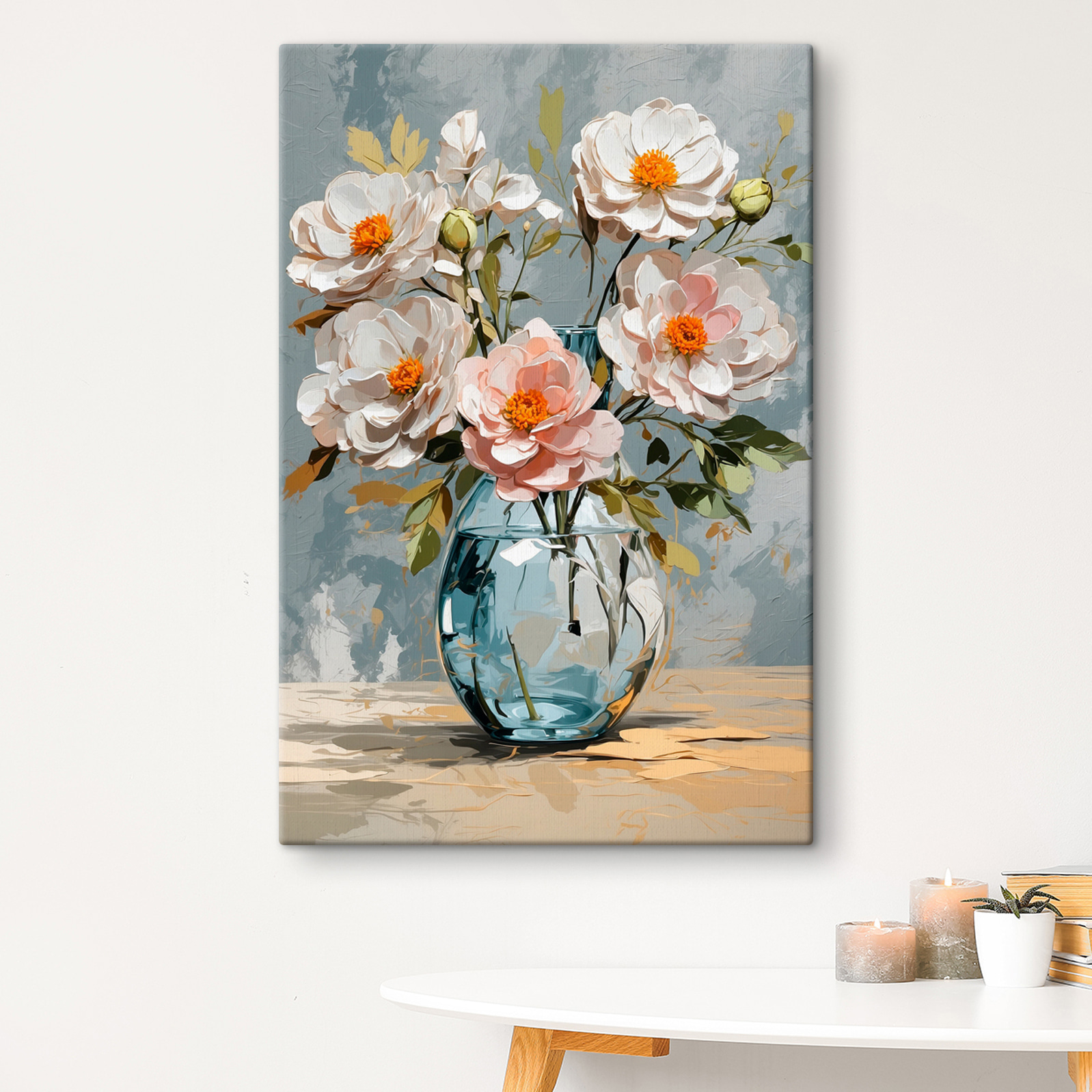 Verschönern Sie jeden Raum mit diesem charmanten Leinwandbild, das eine Vase voller schöner Blumen zeigt. Die sanften Farben und die zarten Pinselstriche laden dazu ein, innezuhalten und die Schönheit der Natur zu genießen, fast wie eine sanfte Erinnerung daran, innezuhalten und an den Rosen zu riechen – wenn sie nur tatsächlich duften würden! Stellen Sie sich vor, es hängt über einer gemütlichen Leseecke oder vielleicht in der Küche, wo es zu kulinarischen Abenteuern inspirieren kann. Jeder Blick bringt ein wenig Wärme und Freude mit sich, perfekt, um eine fröhliche Atmosphäre zu schaffen. Wer würde sich nicht wünschen, dass dieser fröhliche Farbklecks in der Nähe hängt? Es ist, als hätte man ein Stückchen Natur im Haus!