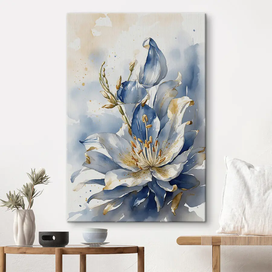 Verschönern Sie jeden Raum mit diesem wunderschönen Aquarell-Blumenbild. Stellen Sie sich vor, Sie betreten einen Raum und werden von zarten, in sanften Blau- und Weißtönen gemalten Blütenblättern begrüßt – ein sofortiger Stimmungsaufheller! Es ist, als hätte man ein Stück Frühling direkt an der Wand, ohne dass man sie gießen muss. Die zarten Details ziehen den Betrachter in ihren Bann und geben ihm das Gefühl, lebendig zu sein und Geheimnisse aus der Natur zu erfahren. Perfekt für gemütliche Ecken oder als Gesprächsanlass bei der nächsten Zusammenkunft. Sie bringt einen Hauch von Laune mit sich und erinnert jeden an die Schönheit, die uns umgibt. Wundern Sie sich nicht, wenn er der Star des Raumes wird!