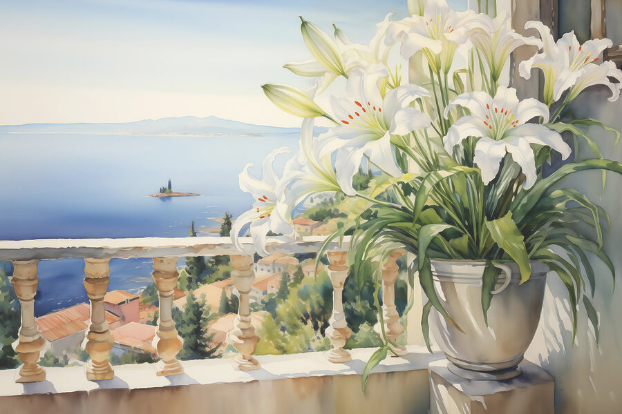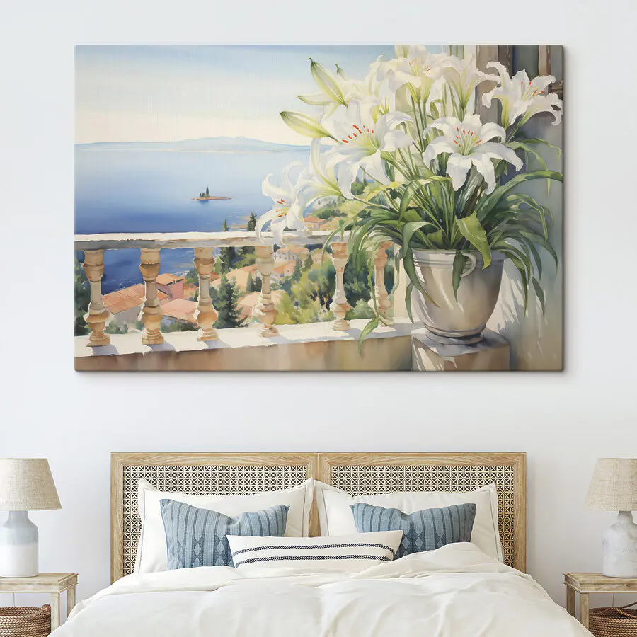 Haben Sie schon einmal davon geträumt, auf einen verträumten mediterranen Balkon zu entkommen, ohne Ihr Zimmer zu verlassen? Das ist der Zauber, den dieses Bild ausstrahlt! Stellen Sie sich strahlend weiße Lilien im Vordergrund vor, die Ihnen von einer sonnenüberfluteten Terrasse aus zuwinken. Sie können fast das leise Rauschen der Meereswellen hören und die sanfte Brise spüren, die durch die zarten Blütenblätter streicht. Es ist nicht nur Kunst – es ist ein kleiner Urlaub an Ihrer Wand. Perfekt, um Ihrem Wohnzimmer, Ihrem Schlafzimmer oder sogar Ihrem Büro einen Hauch von Ruhe zu verleihen – ein schneller Stimmungsaufheller! Und wer würde nicht gerne jeden Tag mit diesem Anblick aufwachen? Pure Glückseligkeit. 🌸🌊