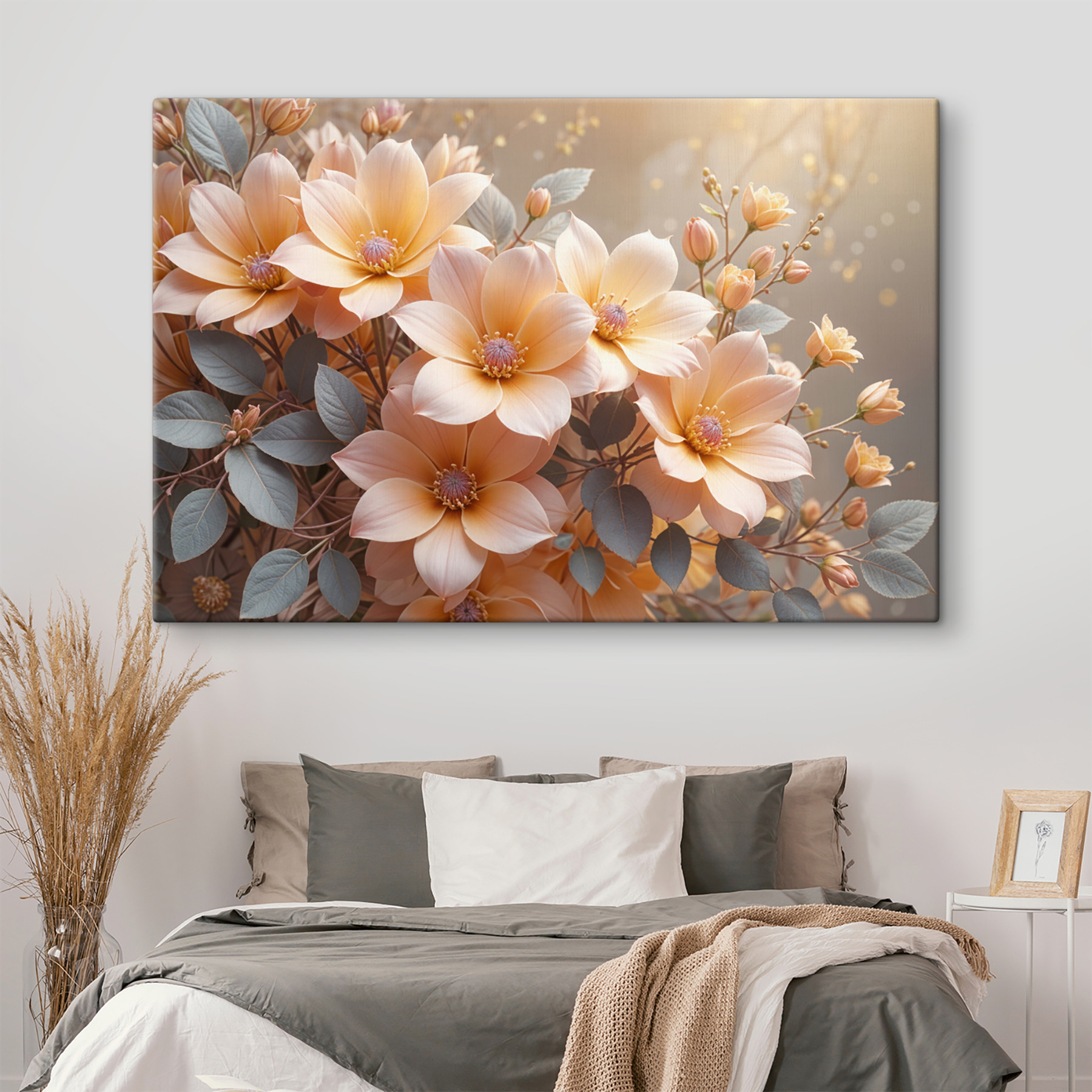 Dieser hübsche Leinwanddruck mit einer Gruppe von Blumen und zarten Blättern verwandelt jeden Raum. Die sanften Pfirsich- und Grüntöne schaffen eine fröhliche und beruhigende Atmosphäre – perfekt für eine gemütliche Ecke oder einen hellen Flur. Stellen Sie sich vor, Sie gehen vorbei, erhaschen einen Blick auf diese Schönheit und denken an einen blühenden Garten, selbst an einem regnerischen Tag. Dieses Stück bringt nicht nur Farbe, sondern auch Wärme und einen Hauch von Natur nach drinnen. Hängen Sie es auf, und beobachten Sie, wie es die Stimmung im Raum sofort hebt. Es ist wie ein Hauch von frischer Luft, direkt an Ihrer Wand!