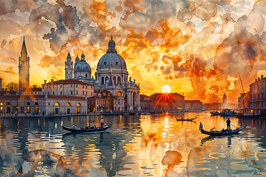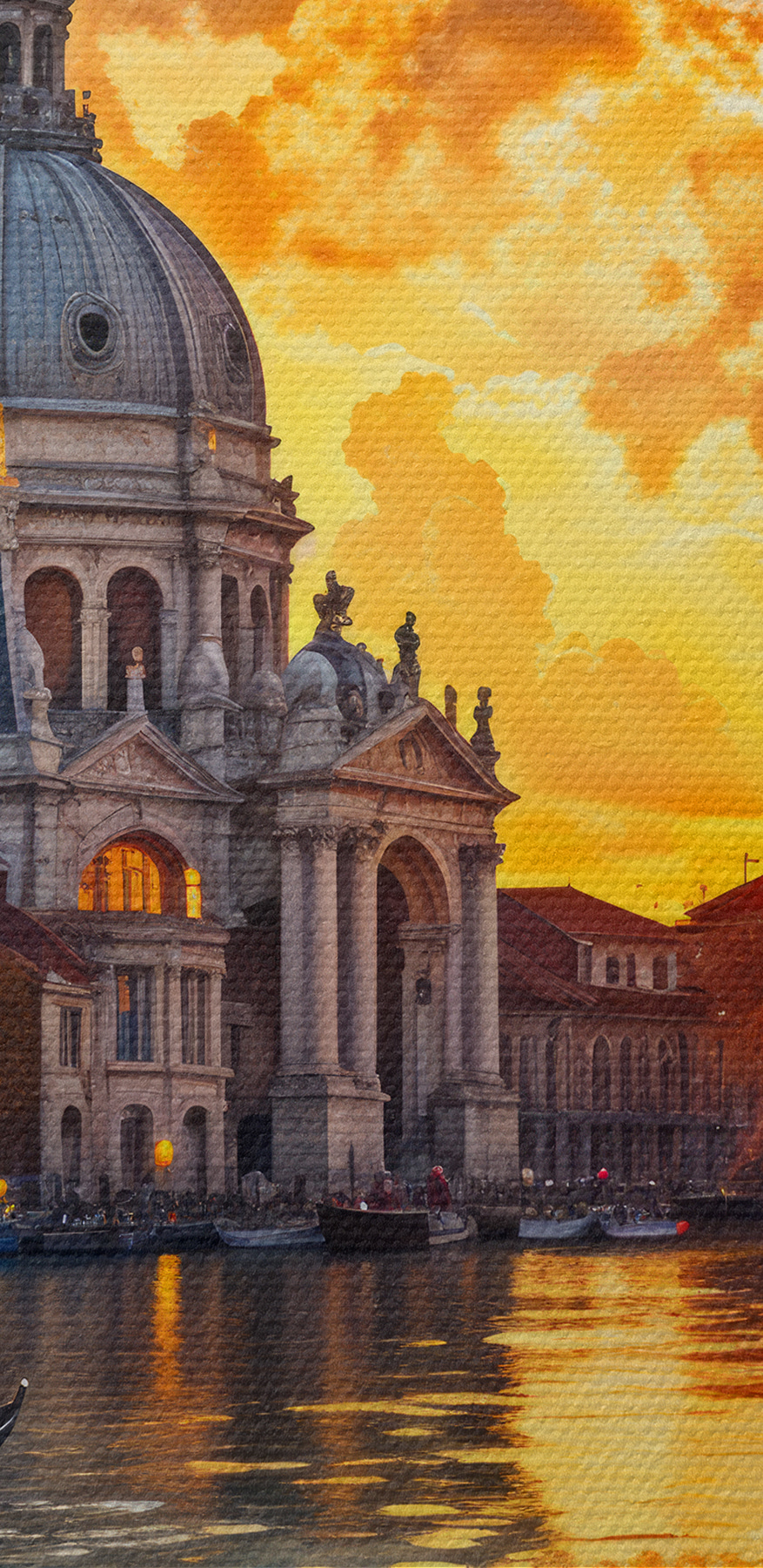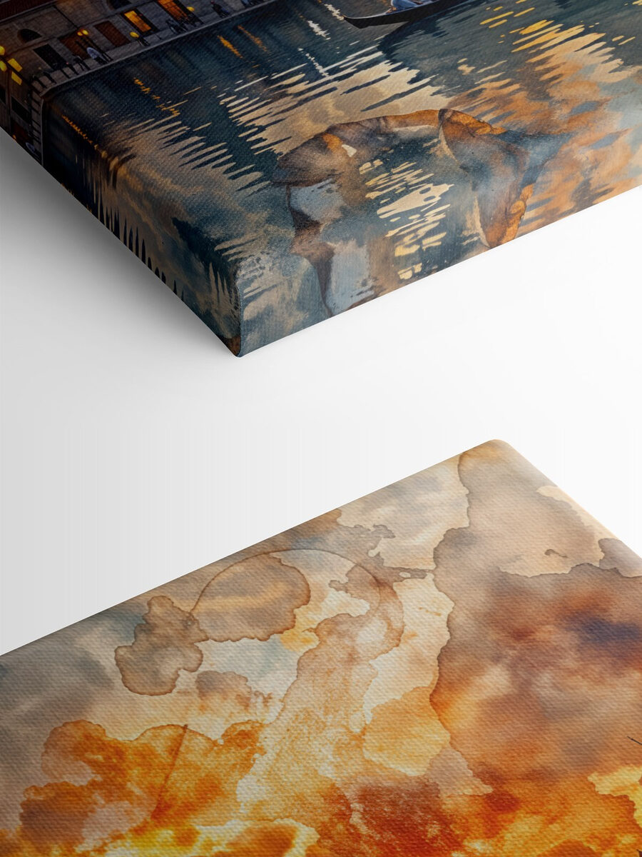 Verwandeln Sie jede Wand in einen ruhigen Zufluchtsort mit diesem faszinierenden Leinwanddruck. Eine malerische Szene entfaltet sich mit ruhigen Gewässern, in denen sich ein atemberaubender Sonnenuntergang und eine charmante Architektur spiegeln. Stellen Sie sich die leisen Geräusche eines vorbeigleitenden Bootes vor, vielleicht ein entferntes Lachen oder das sanfte Plätschern der Ruder im Wasser. Es ist fast so, als würde man sich ein Stück Reisezauber ins Haus holen. Dieses Kunstwerk eignet sich perfekt, um eine friedliche Atmosphäre zu schaffen und regt zu Tagträumen von Küstenspaziergängen und ruhigen Momenten am Wasser an. Es ist eine reizvolle Ergänzung, die zu Gesprächen anregt und ein Gefühl der Ruhe vermittelt. Wer wünscht sich nicht ein Stückchen Gelassenheit für sein Zuhause?