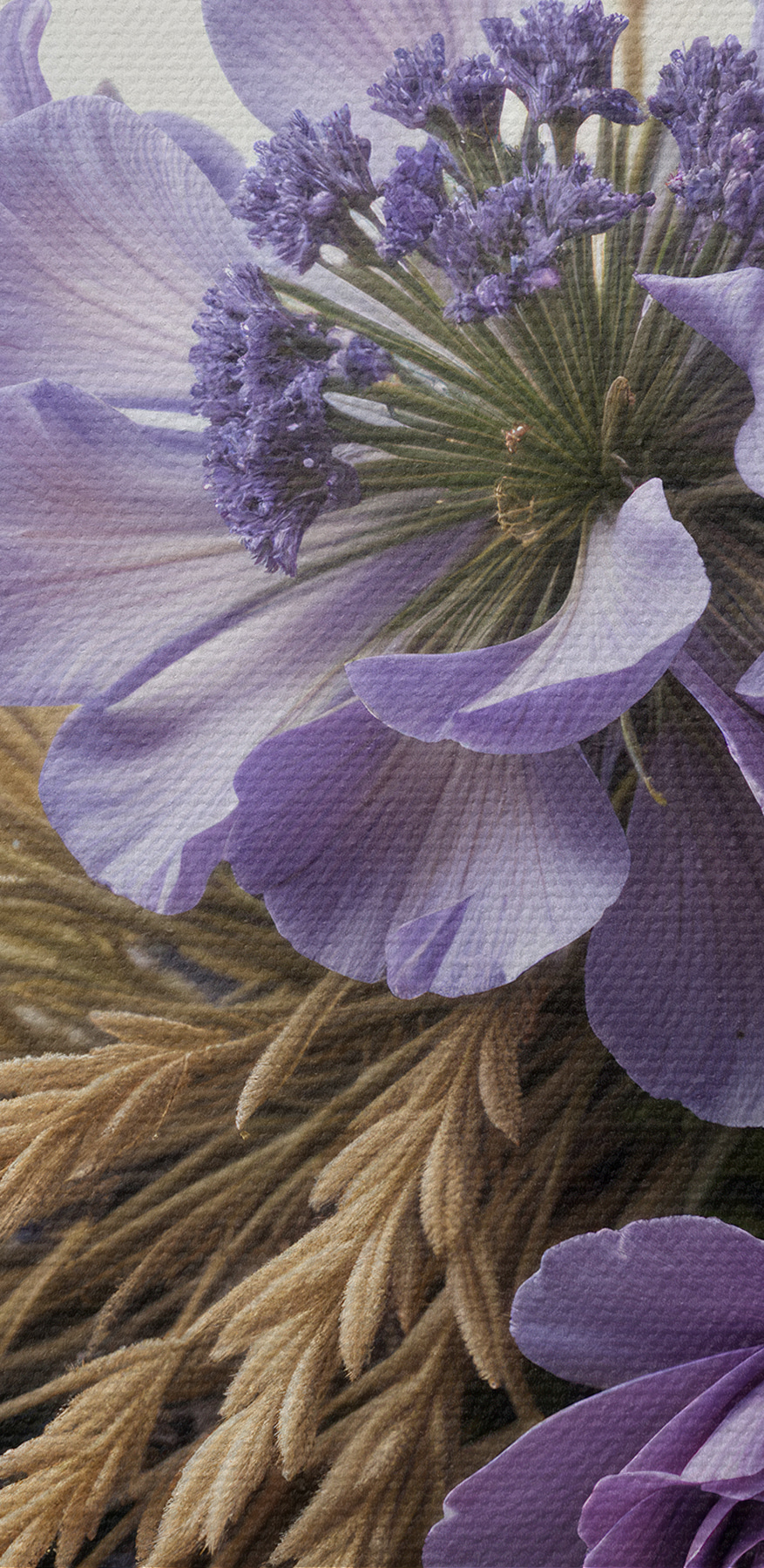 Verschönern Sie jede Wand mit diesem bezaubernden Leinwandbild, das einen herrlichen Strauß lila Blumen und goldenen Weizen zeigt. Es ist, als hätten Sie einen Mini-Garten in Ihrem Wohnzimmer, nur ohne Gießkanne. Stellen Sie sich gemütliche Abende vor, an denen Sie Tee trinken und die warme Atmosphäre spüren. Es ist perfekt für die leere Wand, die schon eine Weile vor sich hin dümpelt. Die sanften Farbtöne und die fließenden Strukturen vermitteln ein Gefühl der Ruhe und Gelassenheit – wer würde sich das nicht wünschen? Außerdem ist es ein fantastischer Gesprächsanlass. Stellen Sie sich vor, wie Ihre Freunde diesen wunderschönen Ausbruch der Natur bewundern.