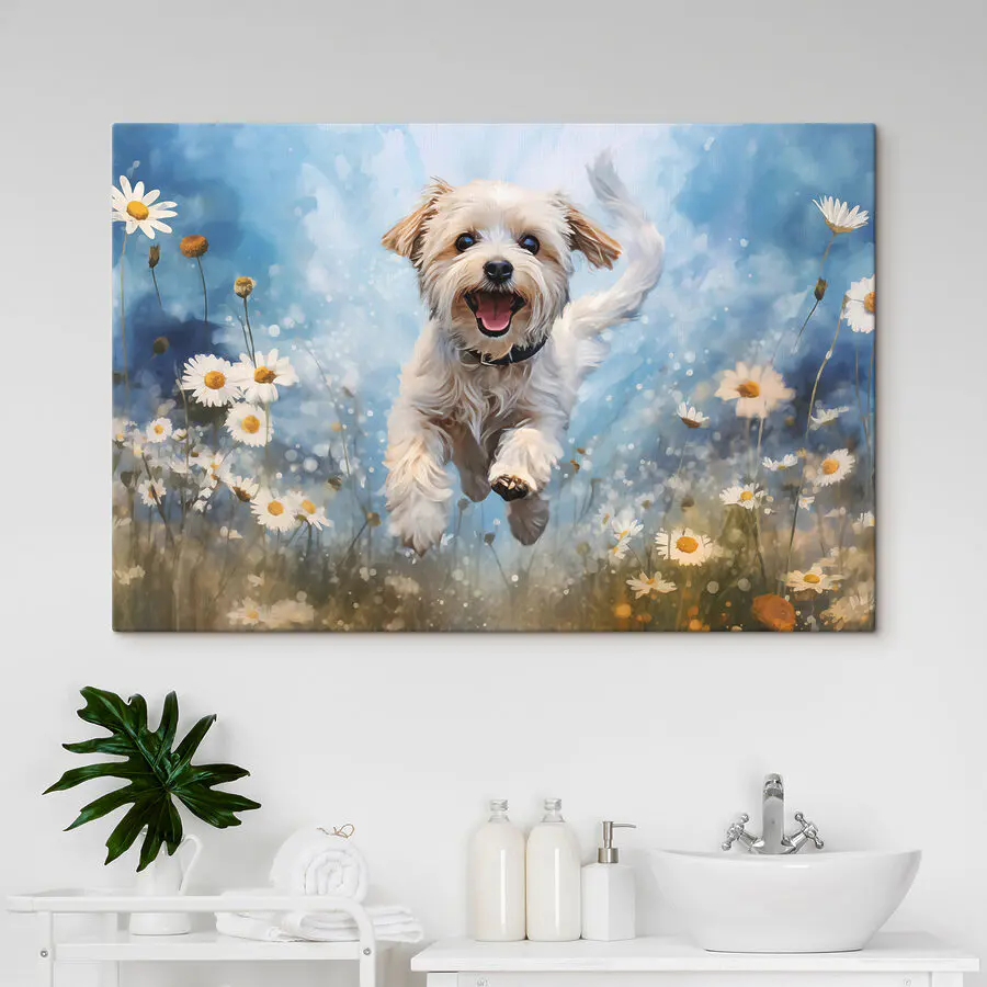 Fangen Sie den fröhlichen Geist verspielter Welpen mit diesem entzückenden Leinwanddruck ein, der einen Hund zeigt, der durch ein Feld voller Gänseblümchen springt. Es ist mehr als nur Dekoration; es ist wie ein kleiner Ausbruch von Glück an Ihrer Wand. Stellen Sie sich vor: Jedes Mal, wenn Sie vorbeigehen, werden Sie mit einem Schnappschuss purer Freude belohnt. Es ist perfekt, um ein Wohnzimmer oder sogar die gemütliche Ecke, in der Sie Ihren Morgenkaffee schlürfen, aufzuhellen. Vielleicht bleibt sogar Ihr pelziger Freund stehen und starrt es an – und fragt sich, ob er mitmachen darf. Dieses fröhliche Kunstwerk verbreitet eine verspielte Stimmung, die alle zum Lächeln einlädt, und ist somit eine charmante Ergänzung für jedes Zuhause.