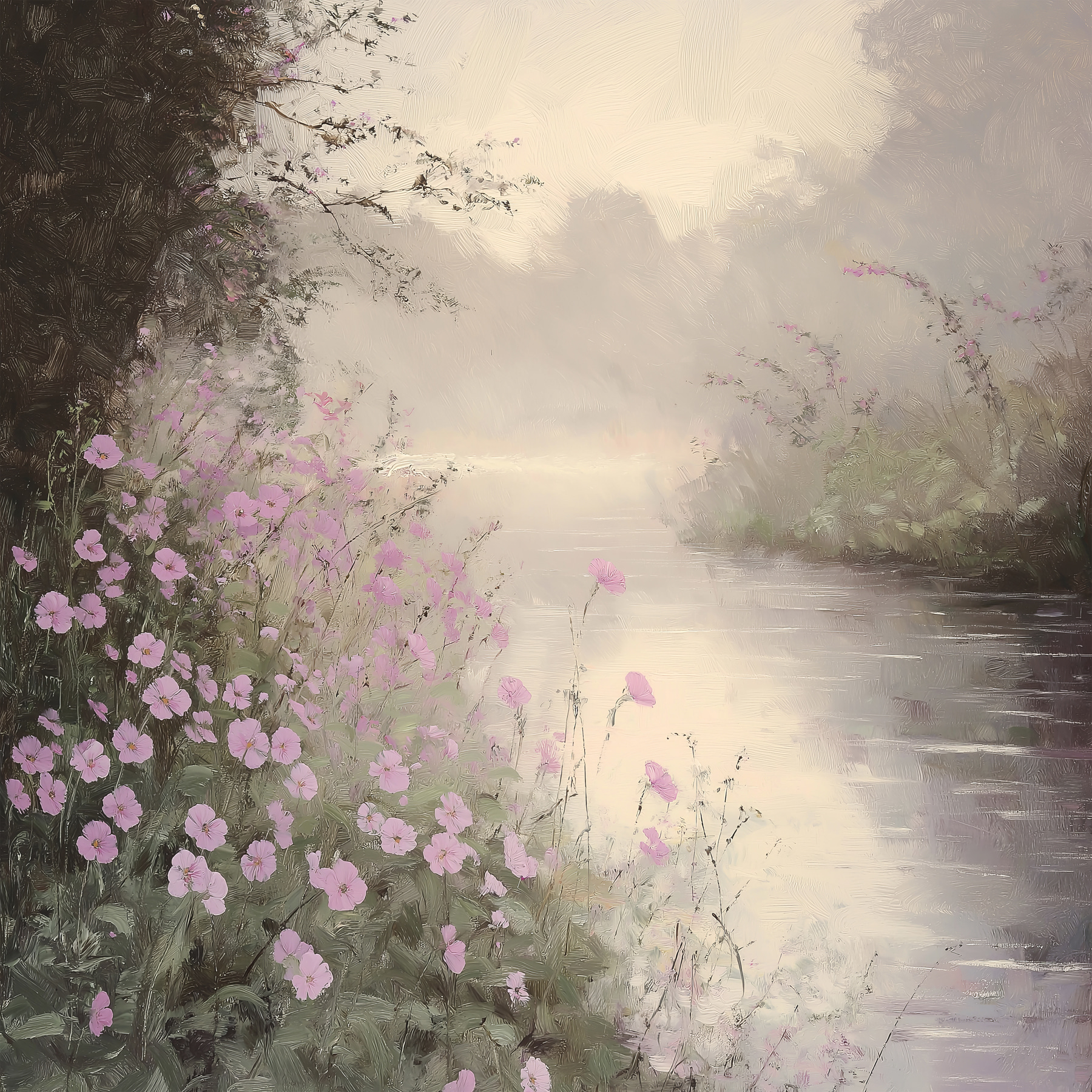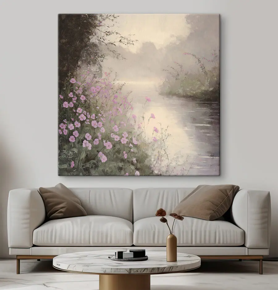 Verwandeln Sie Ihren Raum mit diesem charmanten Leinwandbild, das einen ruhigen Fluss mit zarten lila Blumen zeigt. Stellen Sie sich vor, Sie betreten einen Raum und fühlen sich sofort entspannt, als würden Sie in der Morgendämmerung einen Spaziergang am Wasser machen. Die sanften Farbtöne und die zarten Pinselstriche vermitteln ein Gefühl der Ruhe, das sich perfekt für gemütliche Ecken oder lebhafte Wohnzimmer eignet. Es ist, als hätte man ein kleines Stück Natur genau dort, wo man es braucht. Und seien wir ehrlich – wer würde nicht gerne inmitten einer solch ruhigen Schönheit einen Kaffee trinken? Es ist eine wunderbare Zuflucht, direkt zu Hause.