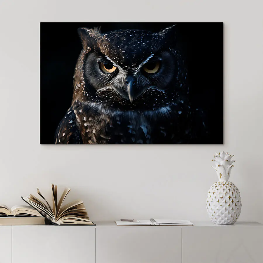 Stellen Sie sich dieses Bild in Ihrem Wohnzimmer, Schlafzimmer oder sogar im Büro vor – ein Gesprächsanlass ist es allemal! Die Mischung aus Schwarz, Weiß und verschiedenen Schattierungen macht es vielseitig und elegant, aber auch ausgefallen. Es wird Ihnen schwer fallen, den Blick von diesen stechenden Augen abzuwenden, wenn Sie vorbeigehen. Außerdem sind Eulen oft Symbole der Weisheit und des Geheimnisses – wer möchte nicht eine weise Eule um sich haben, oder?