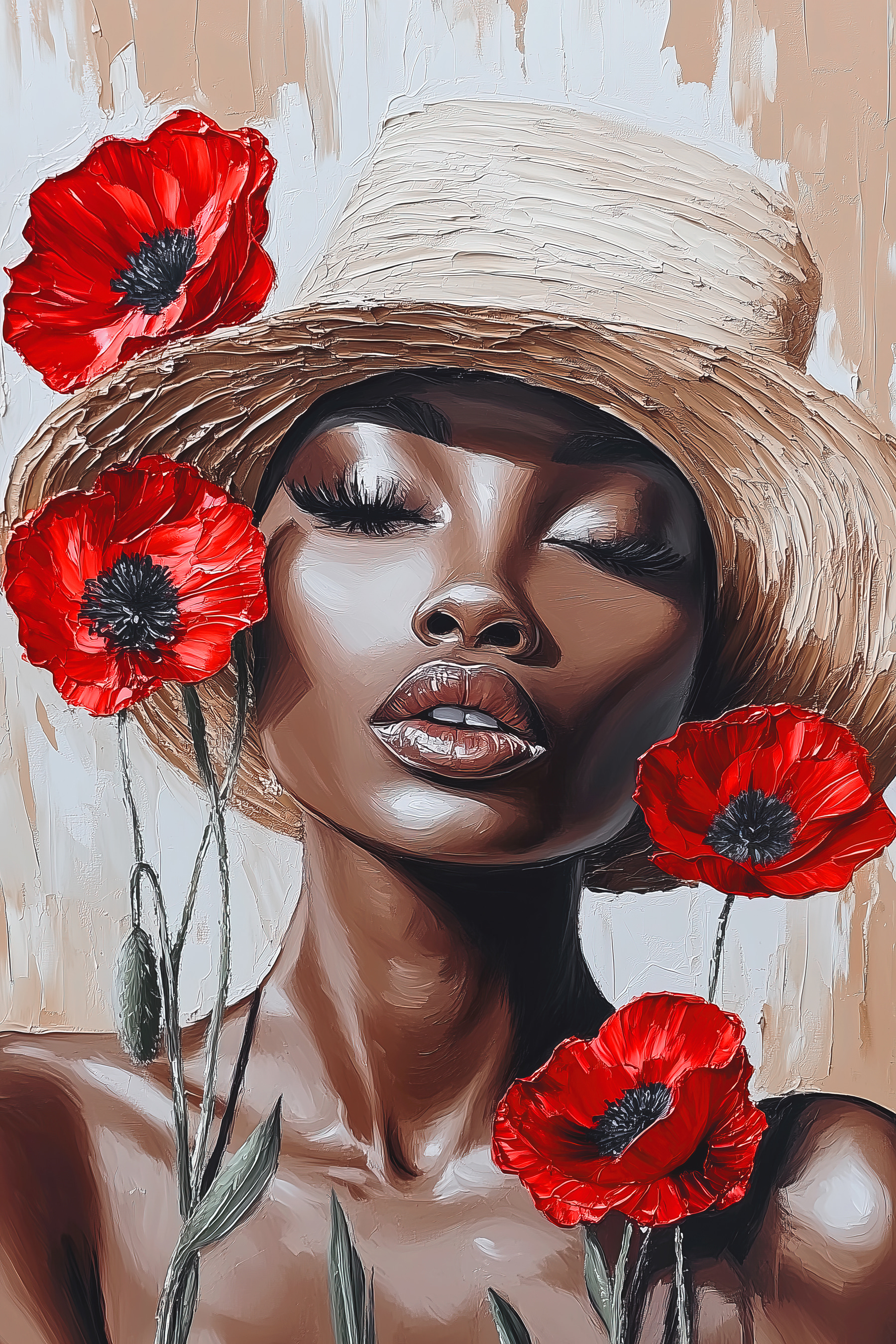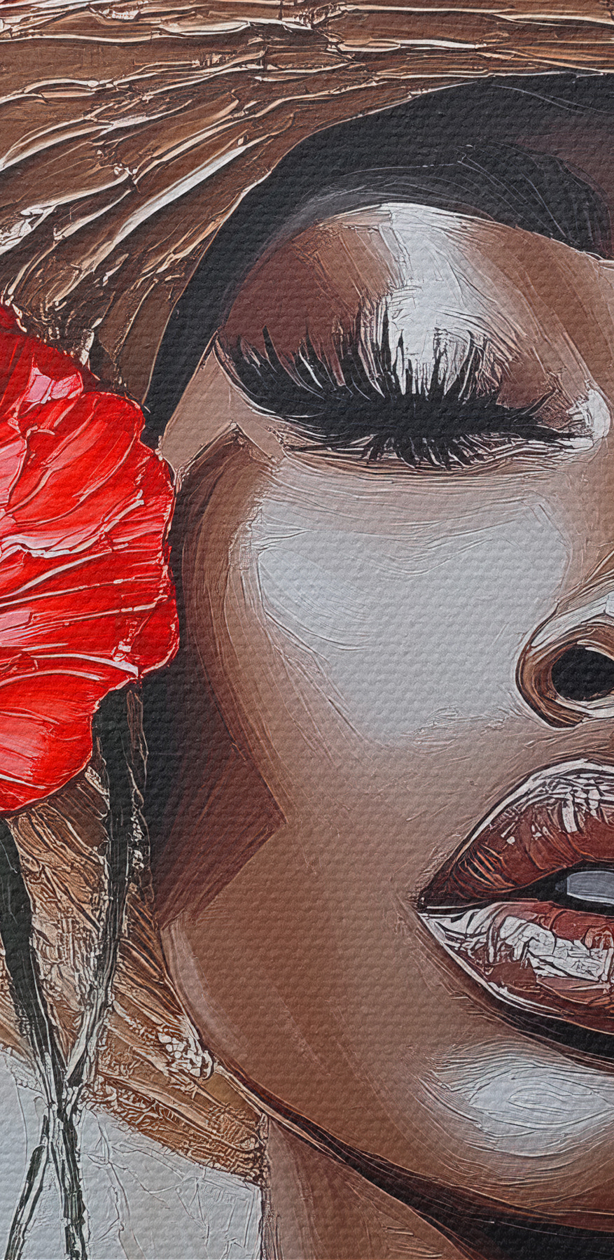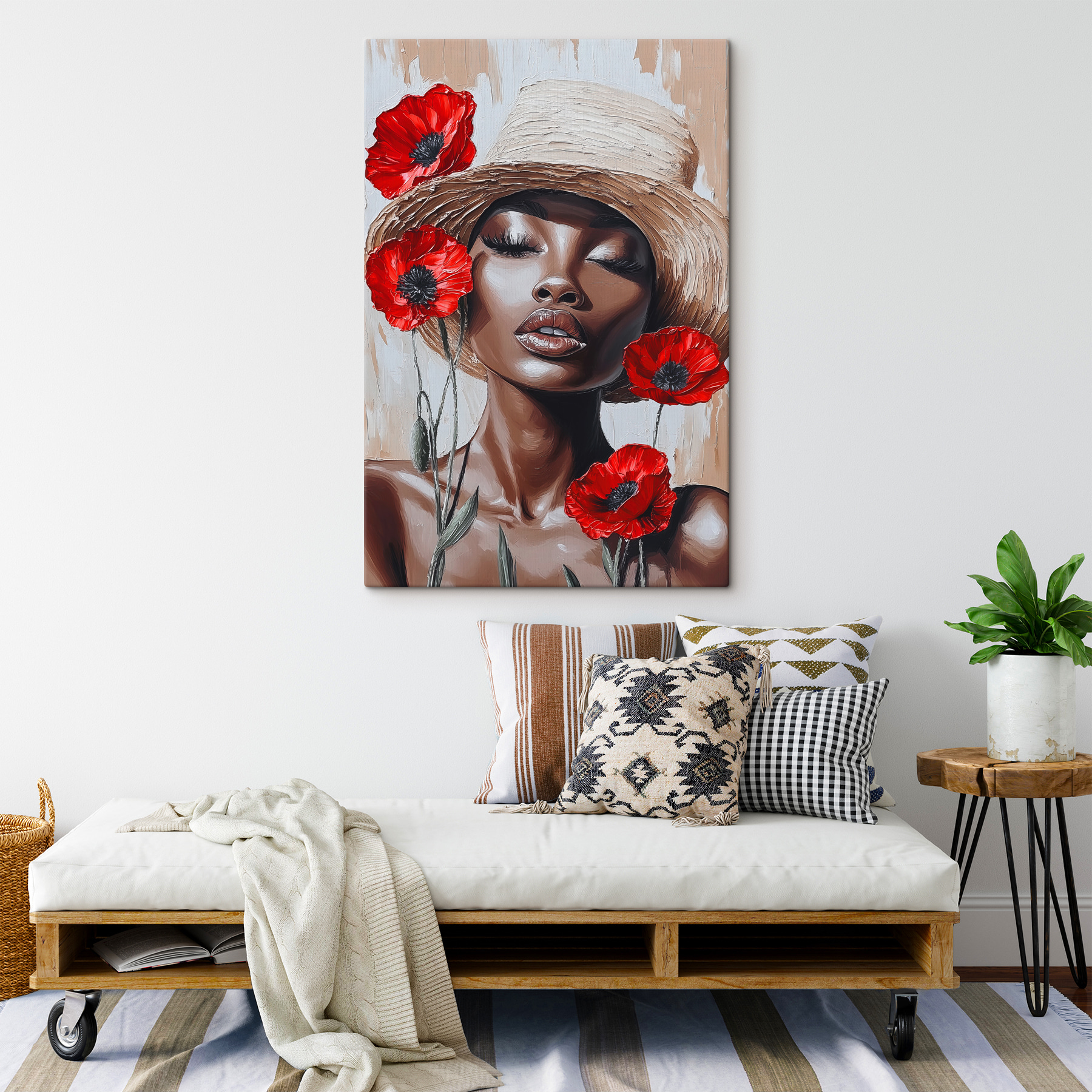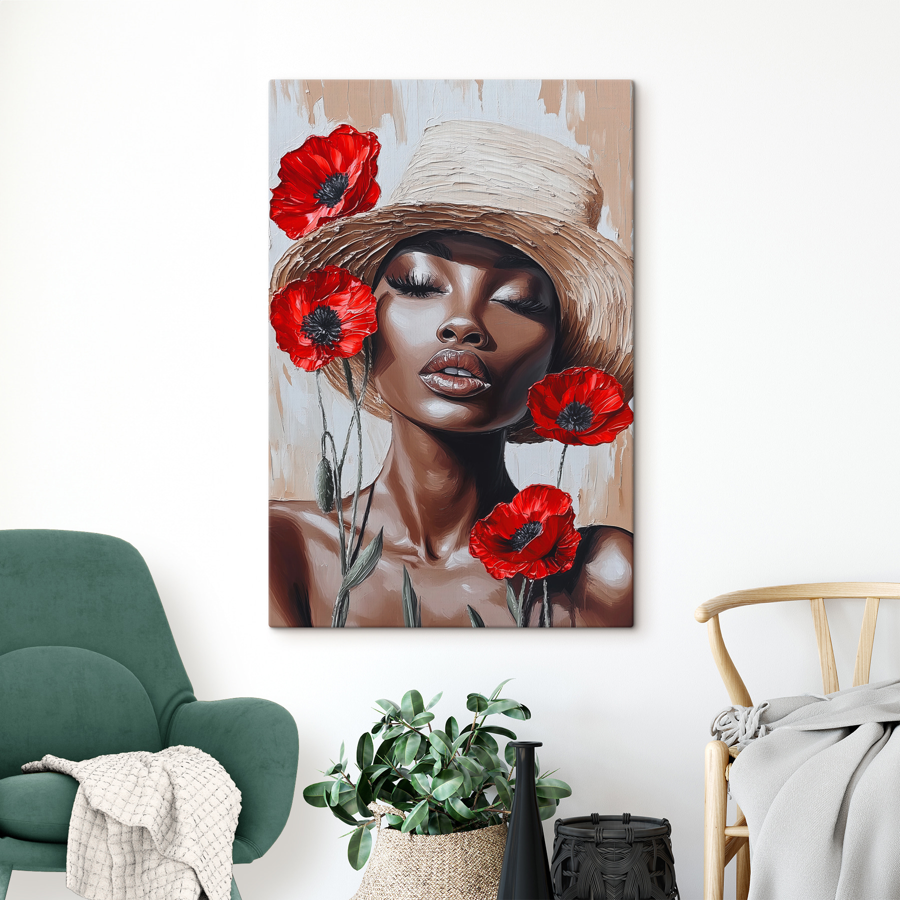 Dieser atemberaubende Leinwanddruck, der eine Frau mit leuchtenden Blumen im Haar zeigt, verwandelt jeden Raum. Es ist wie ein Hauch von frischer Luft – perfekt, um eine gemütliche Ecke zu erhellen oder ein mutiges Statement in Ihrem Wohnzimmer abzugeben. Stellen Sie sich vor, Sie schlürfen Ihren Morgenkaffee, während diese Schönheit über Sie wacht und einen Hauch von Natur und Anmut ins Haus bringt. Die auffälligen roten Blüten setzen einen Farbakzent, der selbst die trübsten Tage vertreiben könnte. Es ist nicht nur Kunst, es ist eine Stimmung, ein kleines Stück Freude, das Geschichten von Sonnenschein und Gelassenheit erzählt. Perfekt für jeden, der etwas Persönlichkeit in seine Einrichtung bringen möchte.