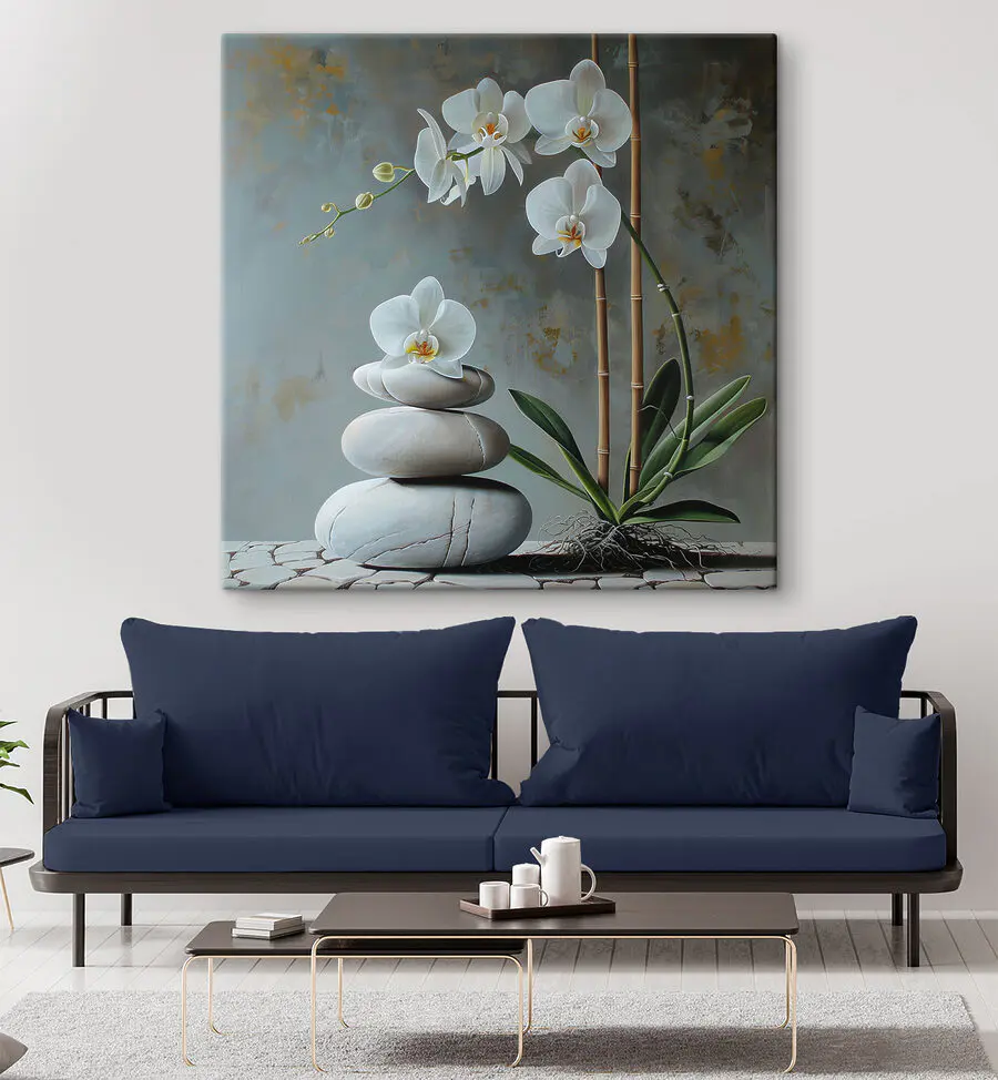 Stellen Sie sich vor, dass Sie jedes Mal, wenn Sie diesen Leinwanddruck betrachten, in eine heitere Oase eintreten. Mit seinen zarten Orchideen, die auf glatten Steinen balancieren, ist es wie ein kleiner Wellness-Tag direkt an Ihrer Wand. Die sanften Farben laden zur Ruhe ein und eignen sich perfekt für Räume, in denen Entspannung wichtig ist – zum Beispiel für Wohnzimmer, Leseecken oder sogar ein gemütliches Schlafzimmer. Sie regt auch zu Gesprächen an, denn was gibt es Faszinierenderes als eine Pflanze und ein paar Felsen? Jedes Mal, wenn ein Blick darauf fällt, wird der Raum von einer Welle der Ruhe durchflutet. Frischen Sie Ihre Einrichtung auf, ohne die Bank zu sprengen; dieses Stück erledigt die schwere Arbeit, während Sie sich einfach zurücklehnen und die Atmosphäre genießen.