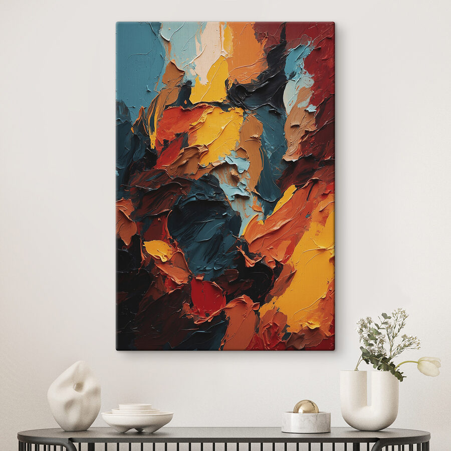 Waren Sie schon einmal von einem Farbspritzer hypnotisiert? Lernen Sie Ihre neue Obsession kennen – das Leinwandbild s40457. Diese Schönheit, die Sie in den Kategorien “Abstrakt”, “Kunst” und “Populär” finden, strotzt nur so vor kühnen Strichen und feurigen Farbtönen. Es ist, als hätte jemand den wilden Tanz der Herbstblätter eingefangen, wobei jedes feurige Orange, tiefes Türkis und leuchtendes Gelb um Ihre Aufmerksamkeit wetteifert.