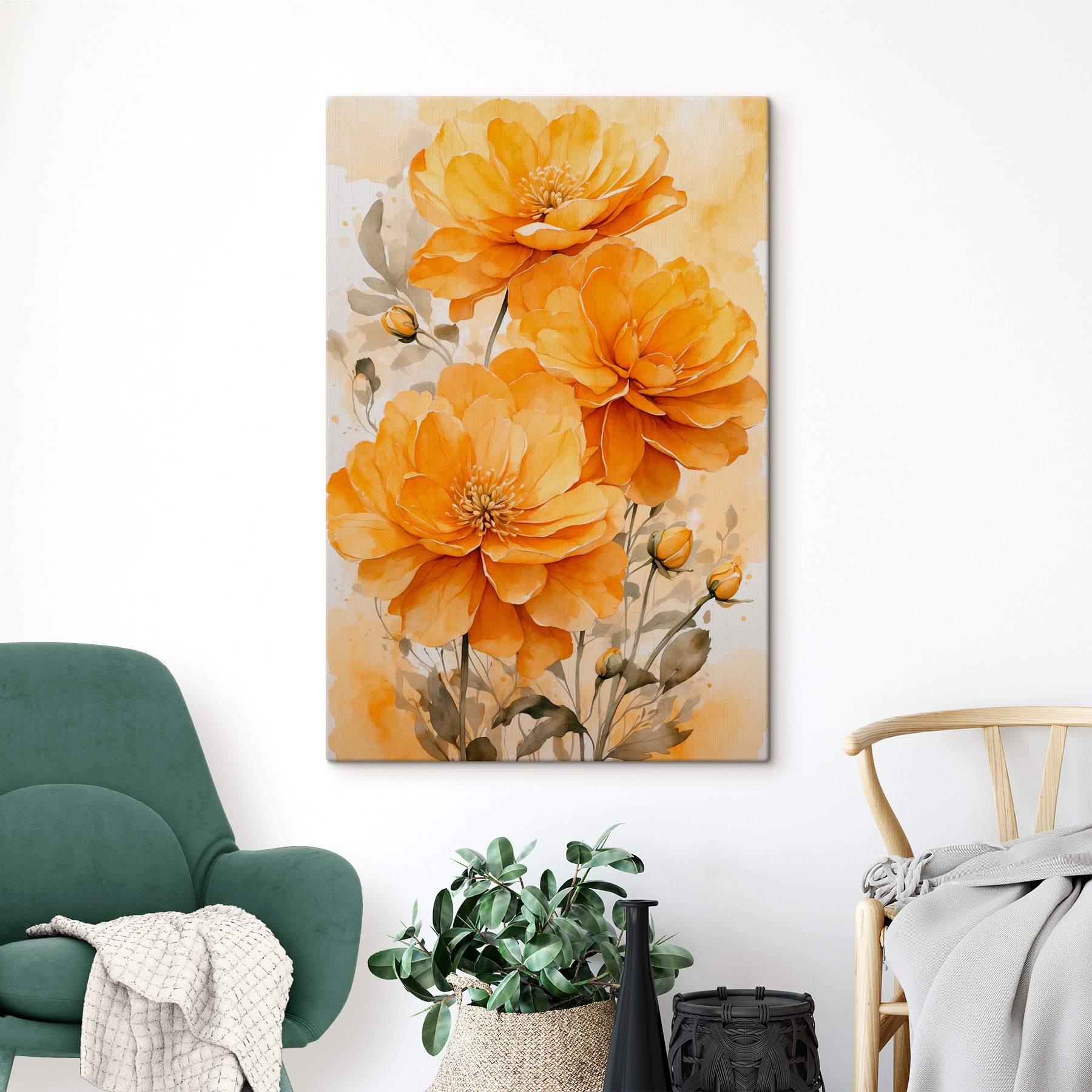 Dieser atemberaubende Leinwanddruck mit orangefarbenen Blumen bringt jeden Raum zum Strahlen. Es ist wie der Frühling in einem Rahmen und strotzt nur so vor leuchtenden Farben, die sofort die Stimmung heben. Stellen Sie sich vor, Sie betreten einen Raum und werden vom warmen Schein dieser Blüten begrüßt, fast so, als würden sie Ihnen etwas Nettes zuflüstern. Perfekt, um eine gemütliche Ecke zu verschönern oder eine leere Wand aufzupeppen, lädt dieses Stück zu einem Lächeln und Komplimenten ein. Ob im Wohnzimmer oder in einem sonnigen Flur, es fühlt sich an wie ein kleines Stückchen Natur im eigenen Zuhause. Wer hätte gedacht, dass Blumen so aufmunternd sein können?