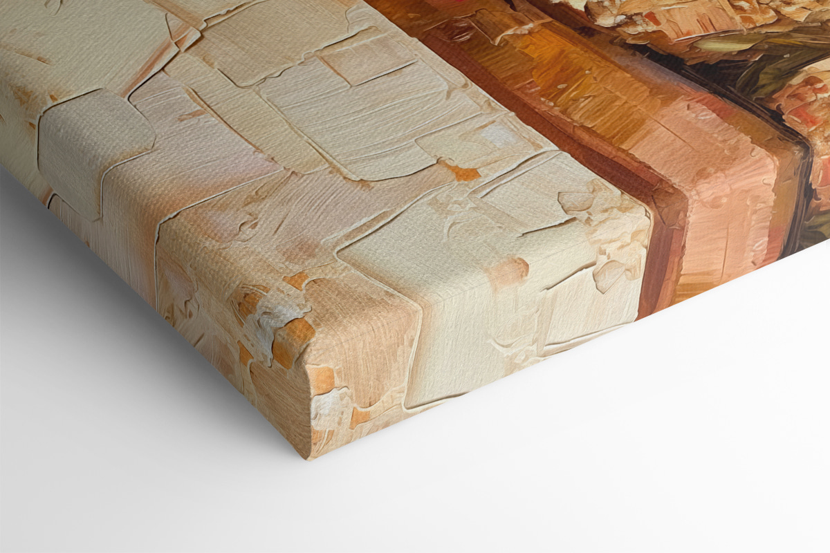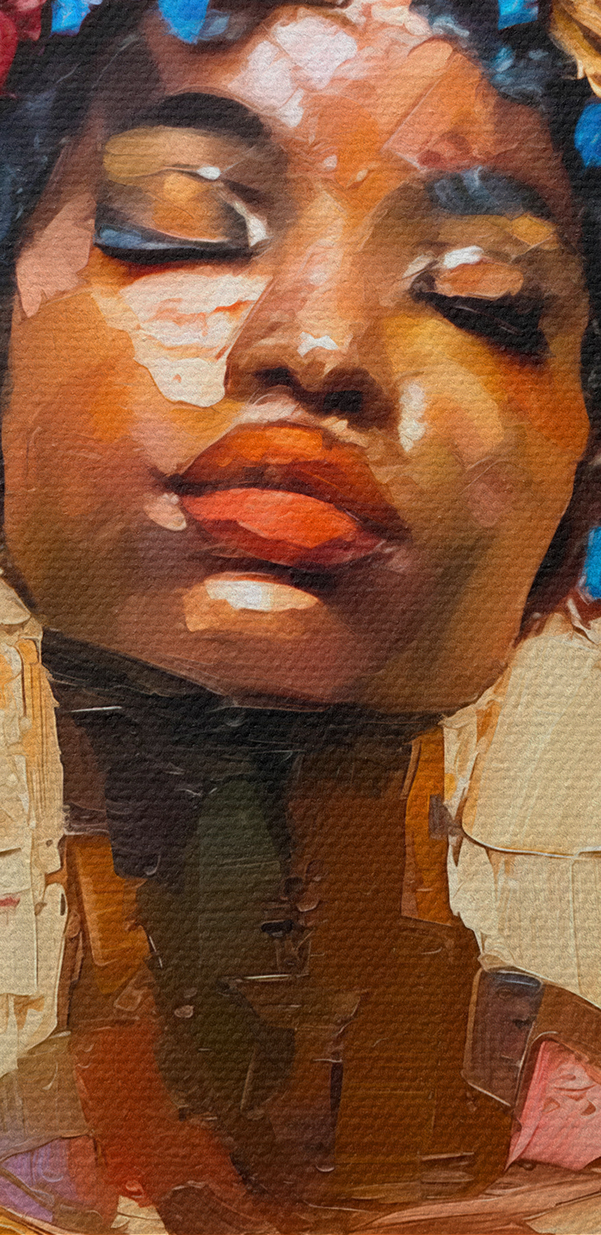 Die Textur ist hypnotisierend; die Pinselstriche springen fast von der Leinwand. Der ruhige Gesichtsausdruck der Frau, gekrönt von einem Strauß bunter Rosen, strahlt eine friedliche und doch kraftvolle Stimmung aus. Es ist, als würde sie inmitten eines Wirbelsturms von Blüten meditieren – wahrlich fesselnd! Ob in einem Wohnzimmer oder in einer gemütlichen Leseecke, dieses Kunstwerk verwandelt jeden Raum in eine Galerie voller Anmut und Charme.