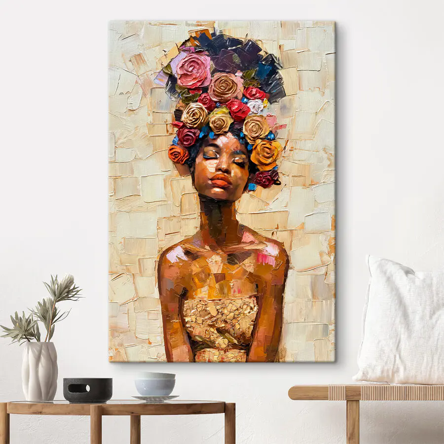 Die Textur ist hypnotisierend; die Pinselstriche springen fast von der Leinwand. Der ruhige Gesichtsausdruck der Frau, gekrönt von einem Strauß bunter Rosen, strahlt eine friedliche und doch kraftvolle Stimmung aus. Es ist, als würde sie inmitten eines Wirbelsturms von Blüten meditieren – wahrlich fesselnd! Ob in einem Wohnzimmer oder in einer gemütlichen Leseecke, dieses Kunstwerk verwandelt jeden Raum in eine Galerie voller Anmut und Charme.