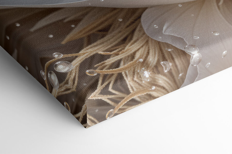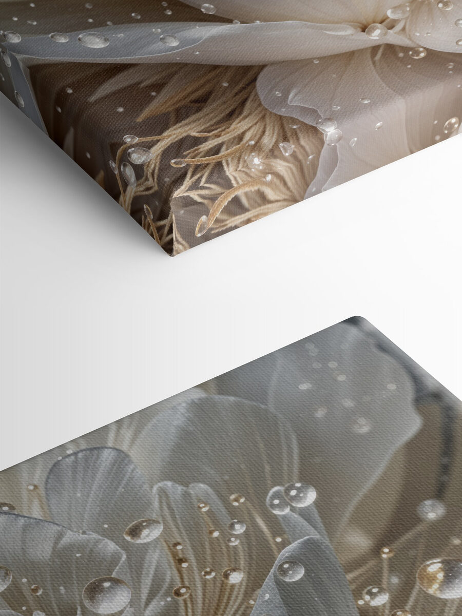 Holen Sie sich einen Hauch von Natur ins Haus mit diesem Leinwandbild Tautropfen auf makellosen weißen Blütenblättern. Stellen Sie sich vor, Sie betreten einen Raum und werden von der zarten Schönheit einer Blume begrüßt, die sanft vom frischen Morgentau glitzert. Es ist wie ein sanftes Flüstern des Frühlings das ganze Jahr über. Dieses Kunstwerk eignet sich perfekt, um Ihren Raum zu verschönern – egal, ob es sich um eine gemütliche Ecke oder den Mittelpunkt Ihres Wohnzimmers handelt – und verleiht ihm eine erfrischende Ausstrahlung, die einfach die Stimmung hebt. Und wer liebt es nicht, wenn es für Gesprächsstoff sorgt? Die Gäste werden von seinem ruhigen Charme angezogen, der sie zu Geschichten über den perfekten Sommergarten anregt. Ein kleines Stückchen Natur direkt an der Wand!