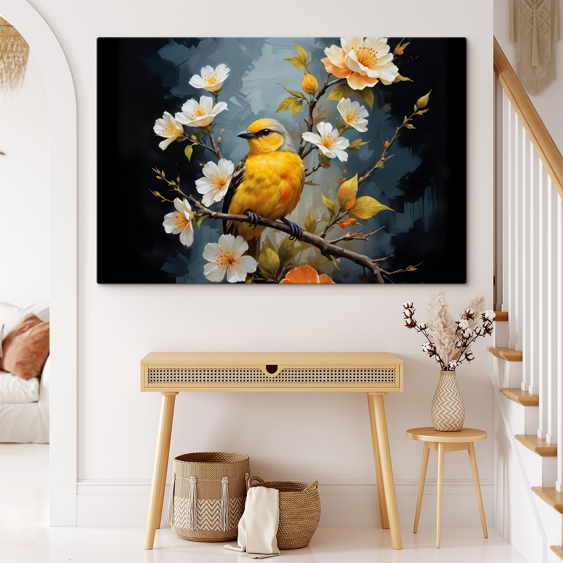 Verschönern Sie jede Wand mit dieser hübschen Leinwand, auf der ein niedlicher Vogel auf einem mit blühenden Blumen geschmückten Ast sitzt. Es ist wie ein kleines Stück Natur direkt in Ihrem Zuhause, das darum bettelt, Freude zu bereiten. Stellen Sie sich vor, Sie betreten einen Raum mit diesem Bild und fühlen sich sofort ruhiger, als ob eine sanfte Frühlingsbrise hereinweht. Die leuchtenden Gelbtöne ziehen die Blicke auf sich, während die zarten Blütenblätter für den perfekten Hauch von Laune sorgen. Ob in einer gemütlichen Ecke oder an der Wand, dieses Kunstwerk bringt Wärme, Charme und ein bisschen Natur in den Alltag. Perfekt für alle, die eine Mischung aus Eleganz und ein bisschen Spaß lieben!