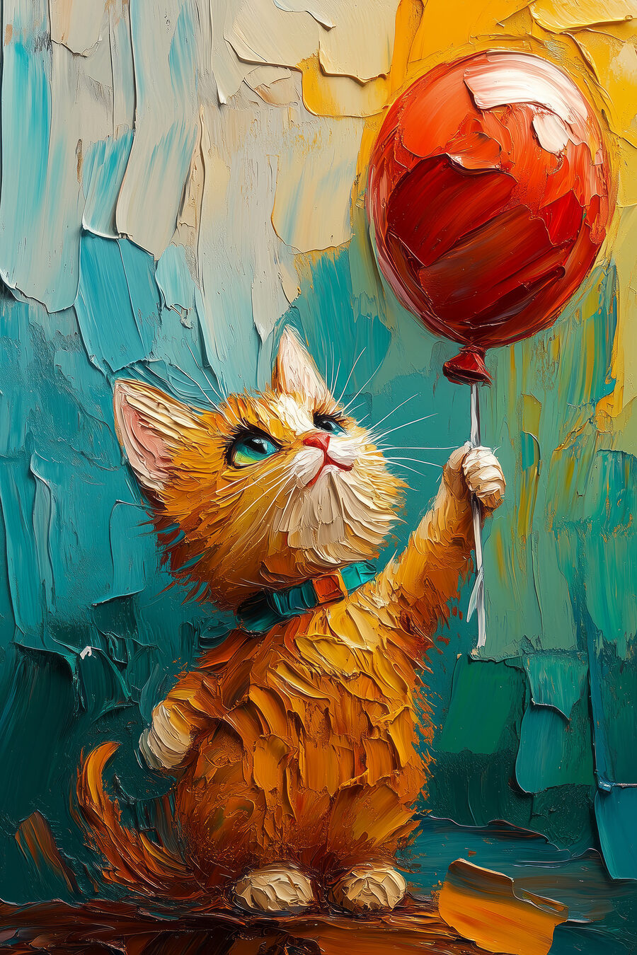 Stellen Sie sich das vor – eine niedliche Katze, die einen leuchtenden Ballon umklammert, mitten in Ihrem Wohnzimmer! Diese Leinwand ist mehr als nur Kunst; sie ist pure Laune. Wer würde nicht jedes Mal lächeln, wenn er es sieht, denn es ist reich an Texturen und verspieltem Charme. Stellen Sie sich vor, wie Ihre Gäste hereinspazieren, sich zweimal umdrehen und in ein Grinsen ausbrechen. Eine verspielte Szene, die jedem Raum einen Farbtupfer und ein bisschen Freude verleiht. Perfekt für alle, die einen Hauch von Tiermagie in ihre Einrichtung bringen wollen.