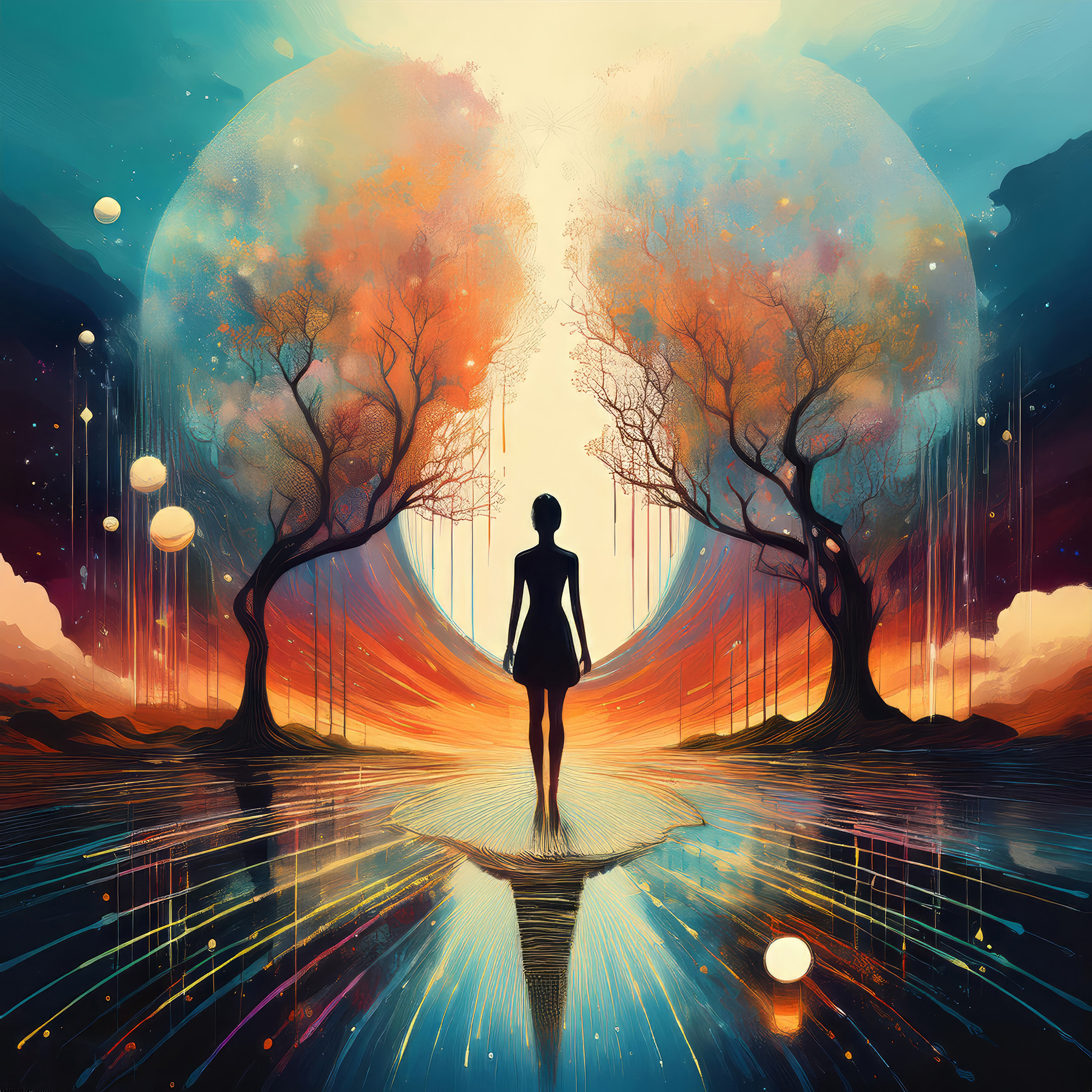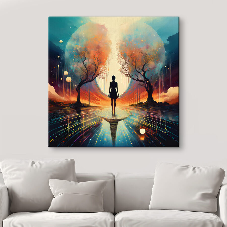 Stellen Sie sich vor: ein ruhiger Abend, an dem der Mond sein sanftes Licht wirft. Das ist es, was in diesem Leinwanddruck zum Leben erweckt wird. Eine Frau steht anmutig auf einer spiegelnden Oberfläche, umrahmt von lebhaften Bäumen und einem großartigen Mond. Es ist nicht nur Kunst – es ist eine Stimmung, ein Gefühl. Hängen Sie eines dieser Bilder in Ihrem Zimmer auf, und plötzlich sind Sie an einem anderen Ort, an dem die Natur ihre Geheimnisse ausplaudert. Spürst du die Ruhe? Außerdem ist es ein hervorragender Gesprächsanlass. Ihre Freunde werden Sie fragen: “Wo hast du dieses traumhafte Stück gefunden?” Und wer liebt nicht ein kleines Kunstgeheimnis?