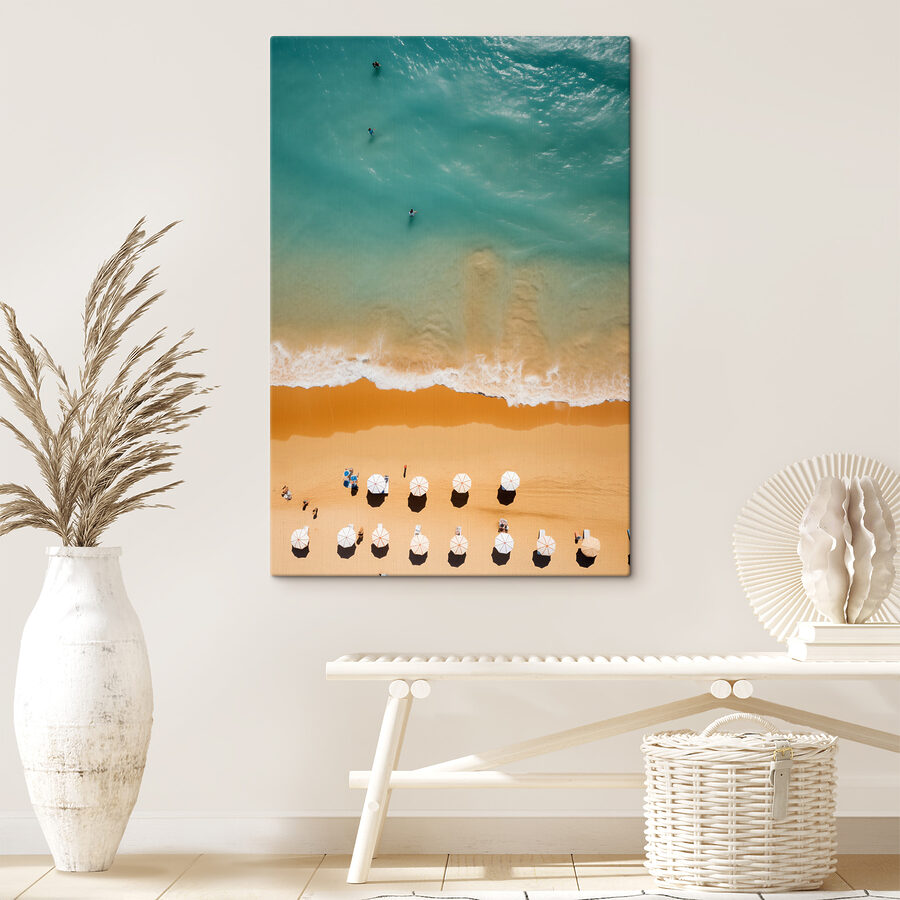 Stellen Sie sich vor, Sie sitzen in Ihrem Wohnzimmer und haben das Gefühl, an einem sonnenverwöhnten Strand zu sein! Dieser Leinwanddruck – “Gruppe von Menschen am Strand mit Sonnenschirmen” – entführt Sie in das sanfte Plätschern der Wellen und an den weichen Sandstrand. Diese kleinen Sonnenschirme? Sie könnten dich dazu bringen, einen Mocktail zu trinken, bevor du es merkst. Sie sind perfekt geeignet, um Ihrem Raum eine ozeanische Atmosphäre zu verleihen, so als ob Ihre Wände jeden Tag ein bisschen Urlaub verkünden würden. Und hey, ist es nicht das, was wir alle brauchen – ein bisschen Sonne im Haus? Tauchen Sie ein!