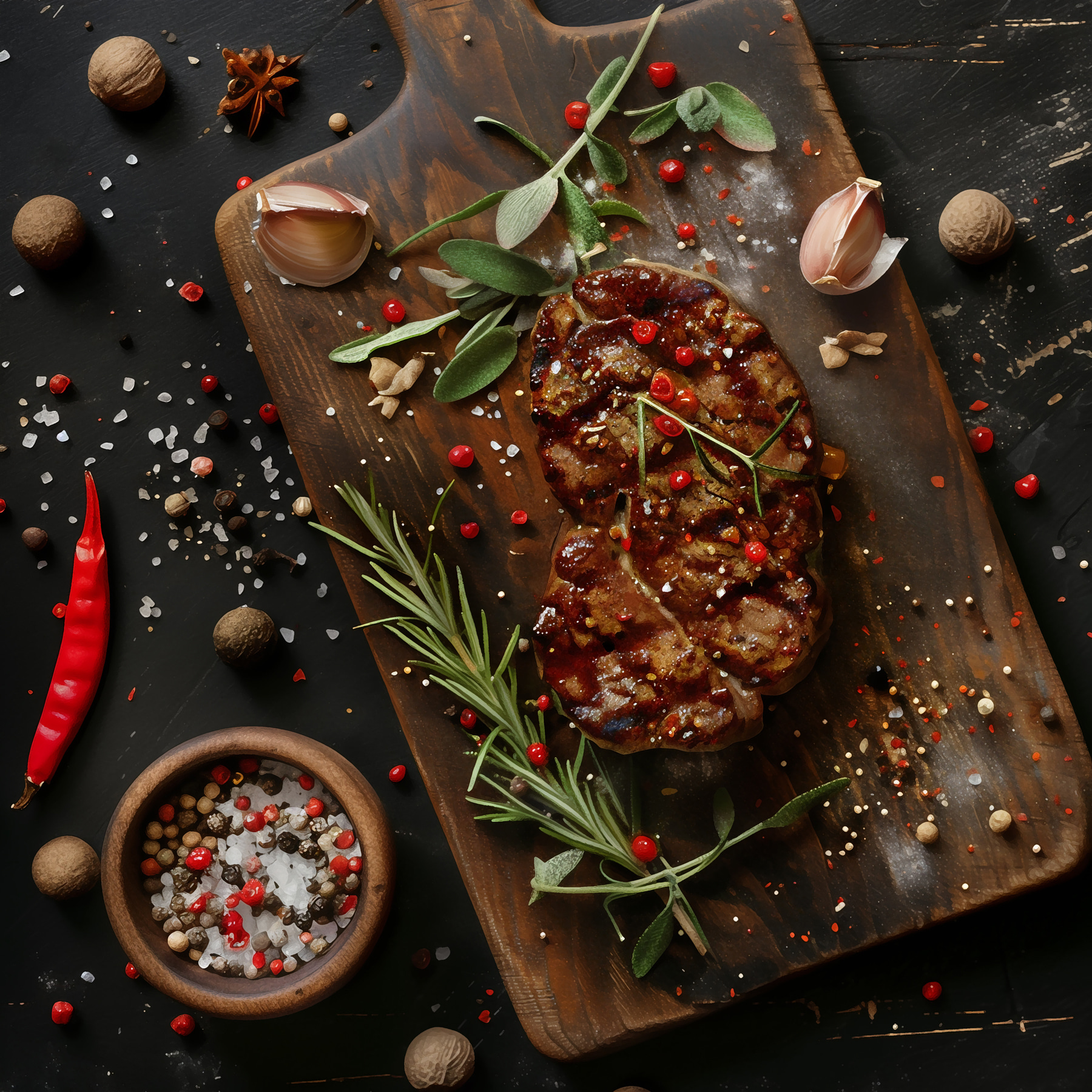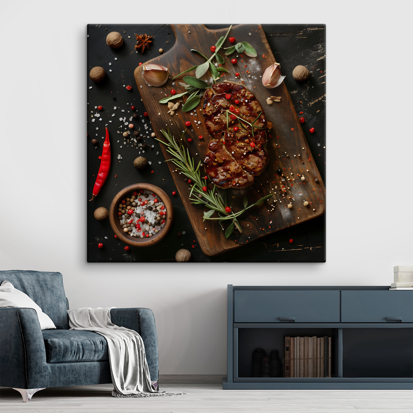 Stellen Sie sich das vor: Die Gemütlichkeit Ihrer Küche trifft auf das künstlerische Flair einer Galerie. Dieser Leinwanddruck mit einem saftigen Stück Fleisch, das mit Gewürzen und Kräutern dekoriert ist, bringt einen Hauch von kulinarischem Abenteuer an Ihre Wände. Es ist, als hätte man die Tafel eines Meisterkochs mitten in der Kreation festgehalten – man kann das Zischen fast hören! Perfekt für Feinschmecker oder alle, die einen Hauch von rustikalem Charme lieben. Hängen Sie es auf, und vielleicht inspiriert es Sie zu Ihrem nächsten Gourmet-Experiment – oder macht zumindest Lust auf ein herzhaftes Steak-Dinner. Köstliche Dekoration gefällig?