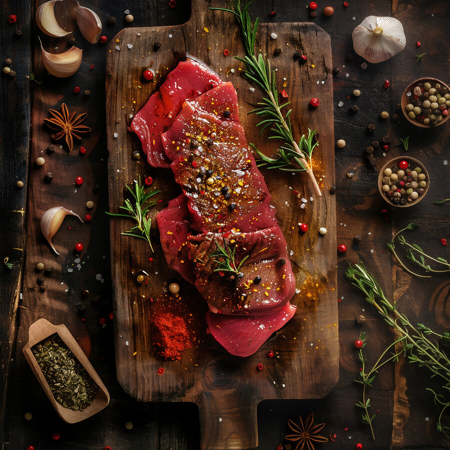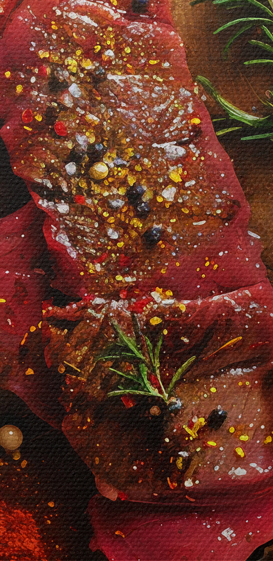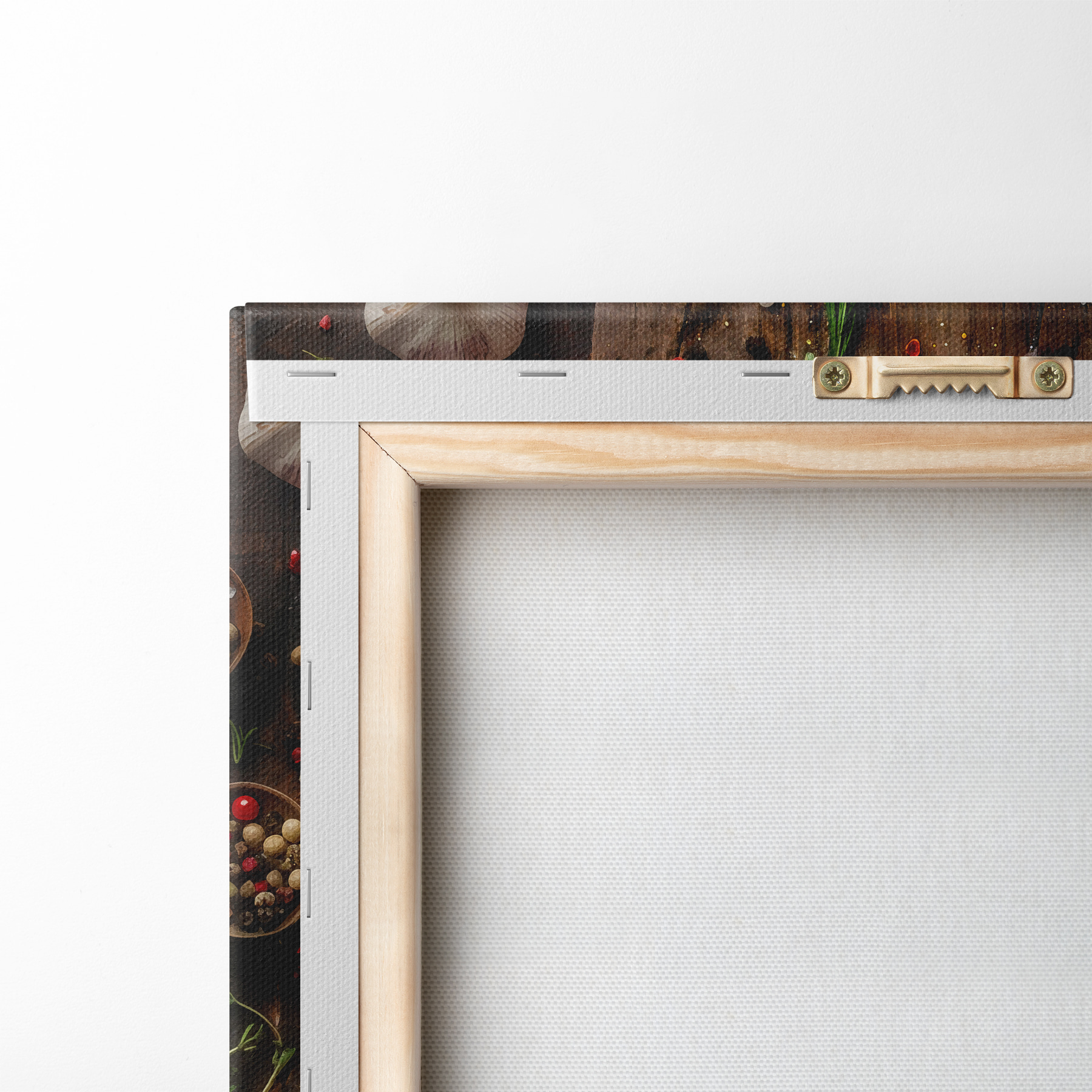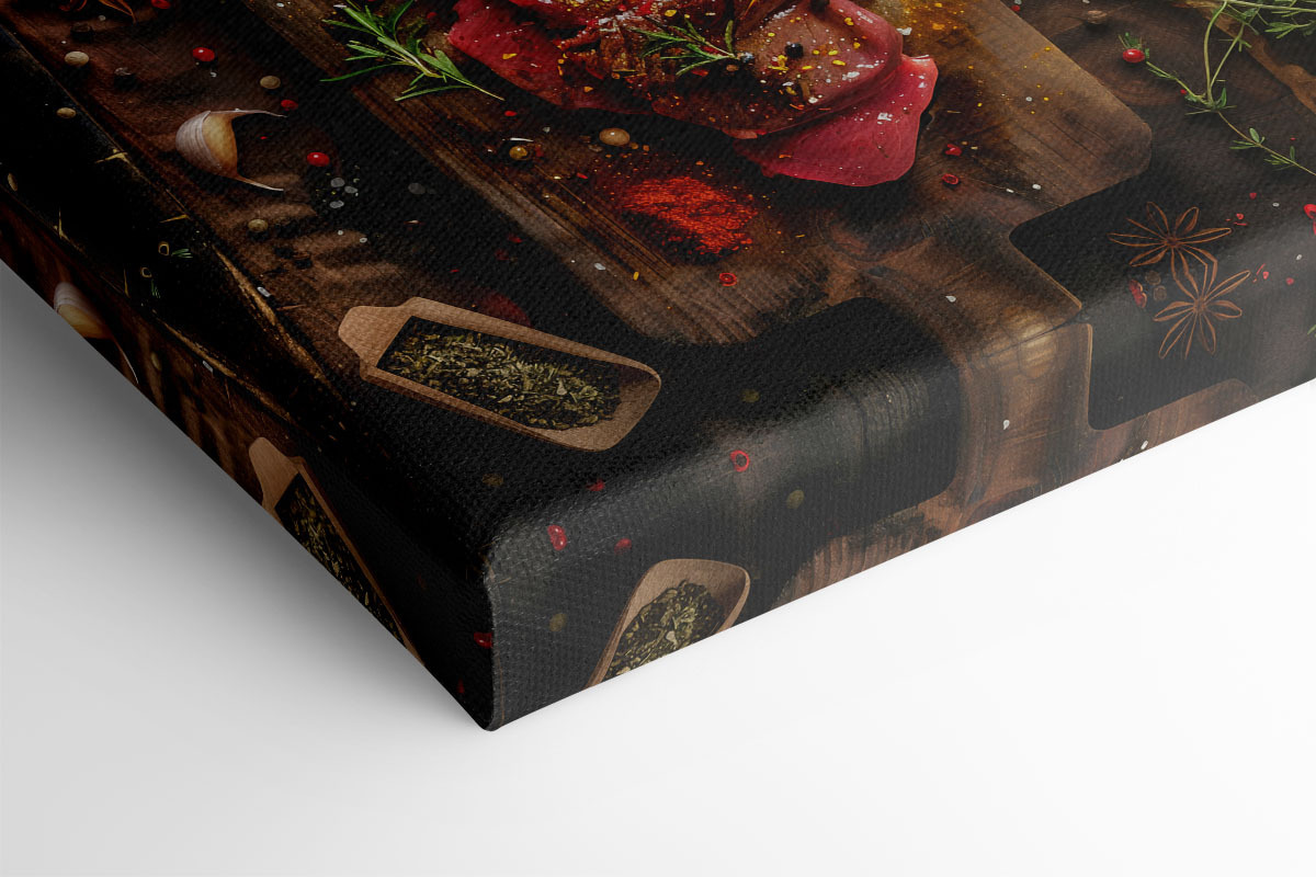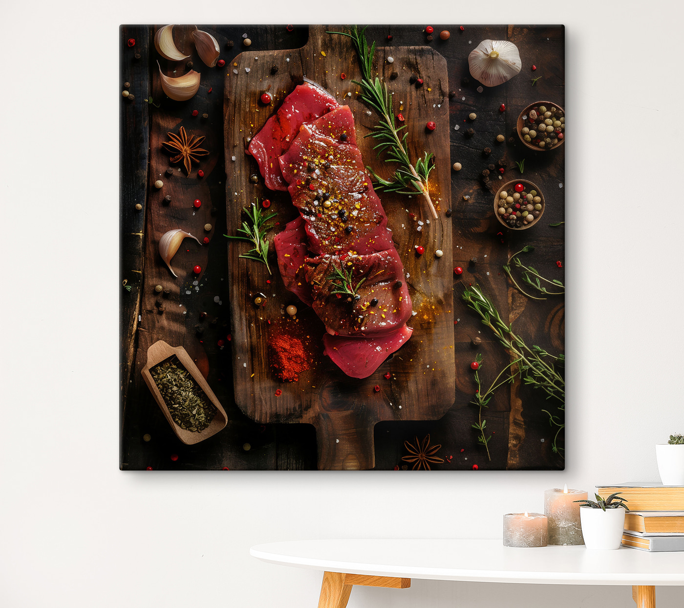 Haben Sie sich Ihre Küche schon einmal als eine Galerie der Meisterwerke vorgestellt? Sehen Sie sich dieses faszinierende Leinwandbild an – “Fleisch auf einem Schneidebrett mit Gewürzen und Kräutern”. Es ist wirklich zum Anbeißen, strahlt Wärme und Gemütlichkeit aus. Genau das, was an einem regnerischen Tag Lust auf einen herzhaften Eintopf macht. Perfekt für Feinschmecker oder alle, die sich nach einem rustikalen Ambiente sehnen. Diese Gewürze sehen aus, als würden sie Geheimrezepte verraten. Hängen Sie es auf und beobachten Sie, wie sich Ihr Raum verwandelt. Warnung! Kann zu spontanen Kochanfällen oder Heißhungerattacken zu ungeraden Stunden führen!