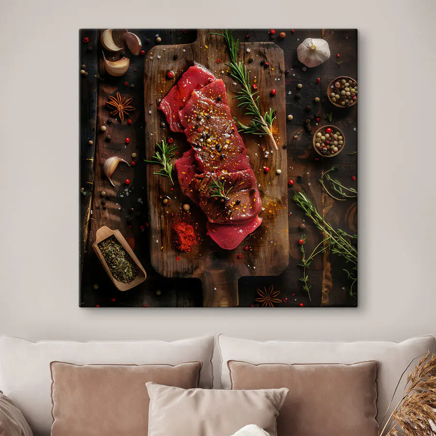 Haben Sie sich Ihre Küche schon einmal als eine Galerie der Meisterwerke vorgestellt? Sehen Sie sich dieses faszinierende Leinwandbild an – “Fleisch auf einem Schneidebrett mit Gewürzen und Kräutern”. Es ist wirklich zum Anbeißen, strahlt Wärme und Gemütlichkeit aus. Genau das, was an einem regnerischen Tag Lust auf einen herzhaften Eintopf macht. Perfekt für Feinschmecker oder alle, die sich nach einem rustikalen Ambiente sehnen. Diese Gewürze sehen aus, als würden sie Geheimrezepte verraten. Hängen Sie es auf und beobachten Sie, wie sich Ihr Raum verwandelt. Warnung! Kann zu spontanen Kochanfällen oder Heißhungerattacken zu ungeraden Stunden führen!