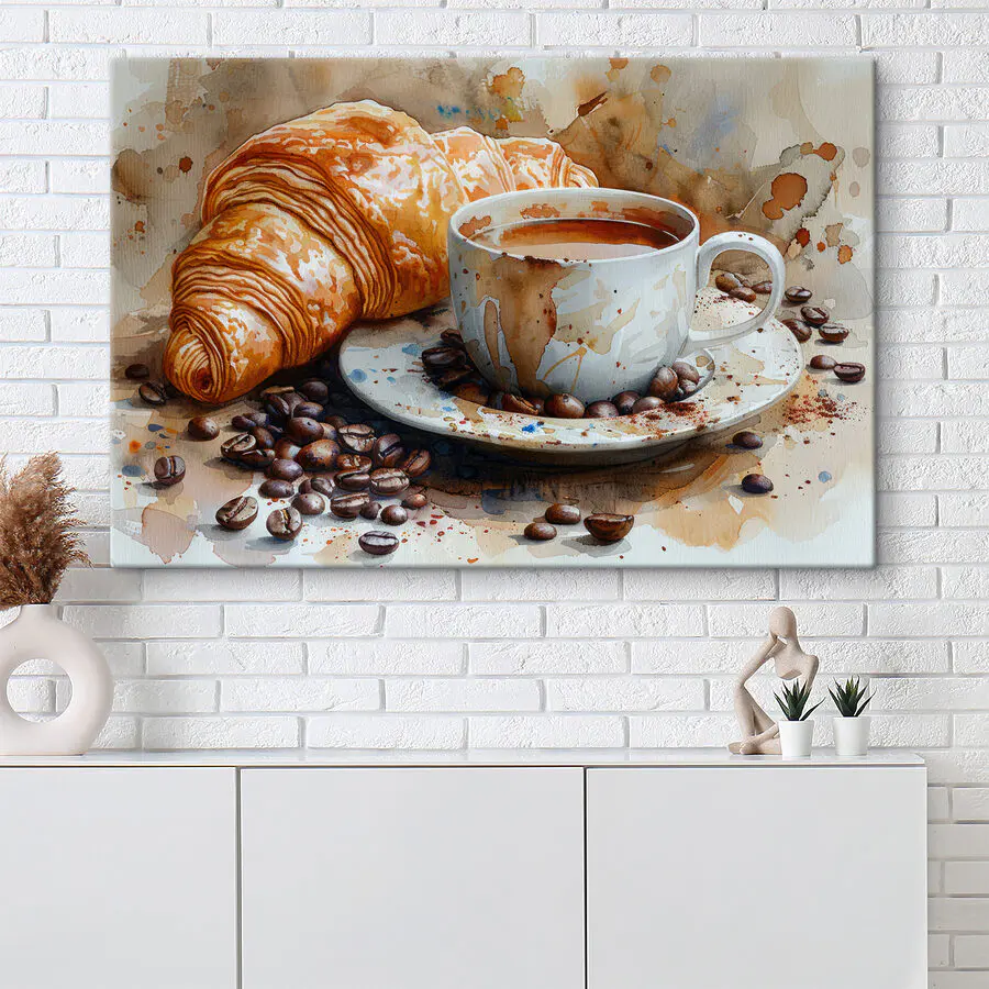 Haben Sie jemals das Gefühl, dass Ihre Wand eine kleine Aufmunterung gebrauchen könnte? Hier ist dieser Aquarell-Leinwanddruck, auf dem eine Tasse Kaffee und ein perfekt gebackenes Croissant die Show stehlen. Es ist, als ob du die gemütliche Ecke deines Lieblingscafés einfangen würdest, nur ohne den Lärm. Stellen Sie sich vor, wie das warme Aroma durch Ihren Raum weht! Perfekt für Küchen oder Essbereiche – einfach überall, wo man von einem Frühstück in Paris träumt. Ob Sie nun ein Kaffeeliebhaber sind oder einfach nur ein gutes Gebäck zu schätzen wissen, dieses Kunstwerk verleiht Ihrem Tag einen Hauch von köstlichem Charme.