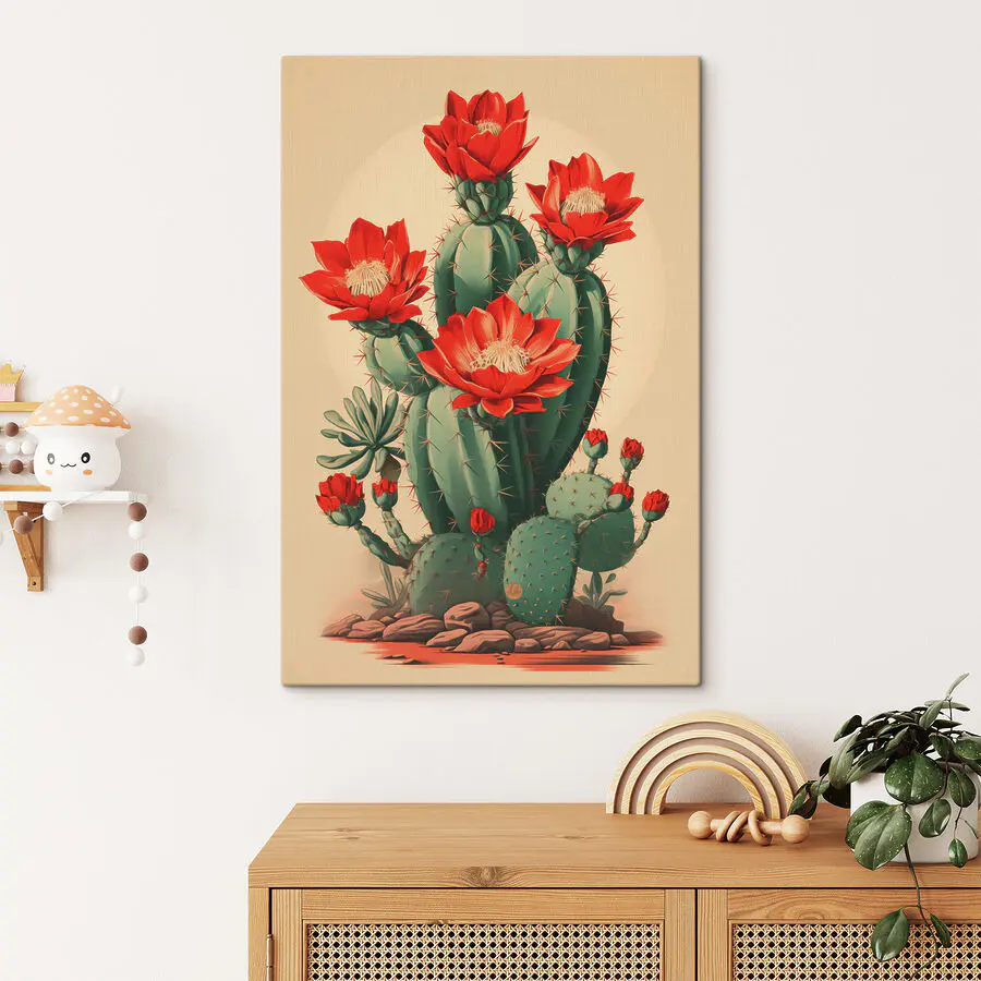 Wenn Sie diesen Leinwanddruck “Kaktus mit roten Blumen” an Ihre Wand hängen, ist es, als ob Sie einen Spritzer des lebendigen Geistes der Wüste direkt in Ihr Wohnzimmer einladen. Es ist, als hätten die Kaktusblüten gerade ihr Lieblingslied gehört und beschlossen, in lebhaften Rottönen zu tanzen. Stellen Sie sich vor, Sie schlürfen Ihren Morgenkaffee unter diesen feurigen Blüten – ein Gesprächsanlass oder einfach ein Moment der Ruhe. Dieses Kunstwerk ist perfekt, um Ihrem Raum einen Hauch von Natur und Laune zu verleihen. Ein Kunstwerk, das wunderbar unerwartet ist und jede Ecke erhellt.