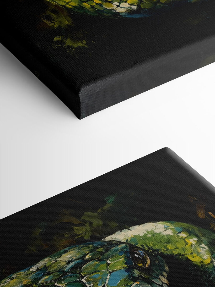 Darf ich vorstellen: Ihr neues Lieblings-Wandkunstwerk: “Grüne Schlange mit gelben Augen”. Dieser Leinwanddruck könnte der Gesprächsanlass sein, von dem Sie nicht wussten, dass Sie ihn brauchen. Diese stechenden Augen folgen Ihnen praktisch durch den ganzen Raum, oder? Es ist, als ob die Schlange Ihnen Geheimnisse aus dem Dschungel zuflüstert, während Sie Ihren Morgenkaffee schlürfen. Perfekt für Tierliebhaber oder diejenigen, die sich einfach ein bisschen ungezähmte Wildheit in ihrem Wohnzimmer wünschen. Stellen Sie sich diese kühne Schönheit über Ihrer Couch vor und verleihen Sie ihr einen Hauch von Intrige – wild, geheimnisvoll und absolut faszinierend.