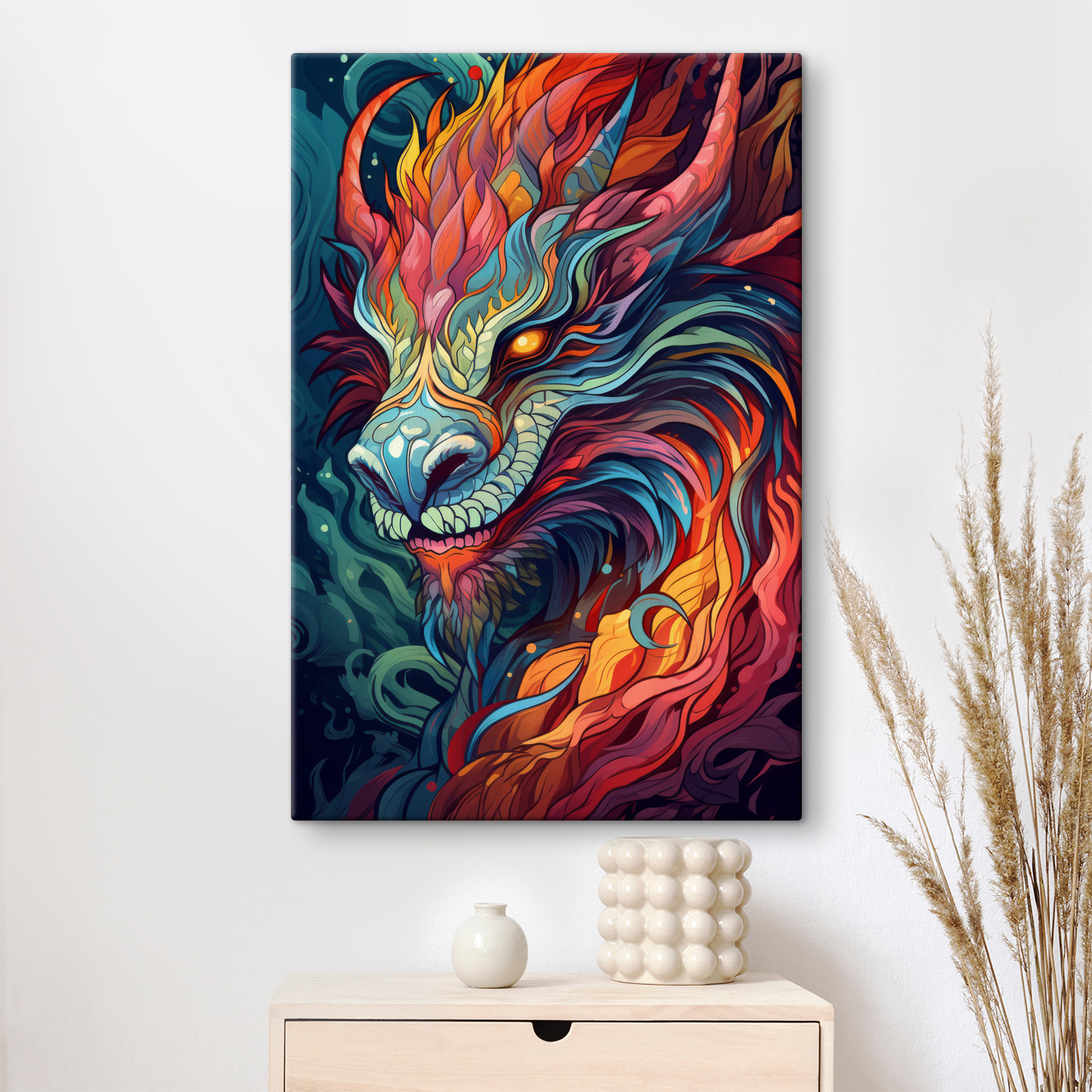 Bereiten Sie sich darauf vor, von den “Wandbilder Colorful Art of a Dragon” verzaubert zu werden. Dies ist nicht irgendein Wandschmuck – es ist ein lebendiger Wirbelwind aus Farbe und Fantasie. Stellen Sie sich diesen kühnen Drachen vor, der Ihren Raum mit seinen feurigen Farben und seinem wilden Ausdruck erhellt. Es ist, als hätten Sie einen Hauch von wildem Abenteuer direkt an Ihrer Wand! Perfekt für alle, die eine Mischung aus mythischen Kreaturen und modernem Kunstflair lieben, bringt dieses Stück einen Hauch von Persönlichkeit und einen sofortigen Gesprächsanlass. Spüren Sie die Magie jedes Mal, wenn Sie den Raum betreten.