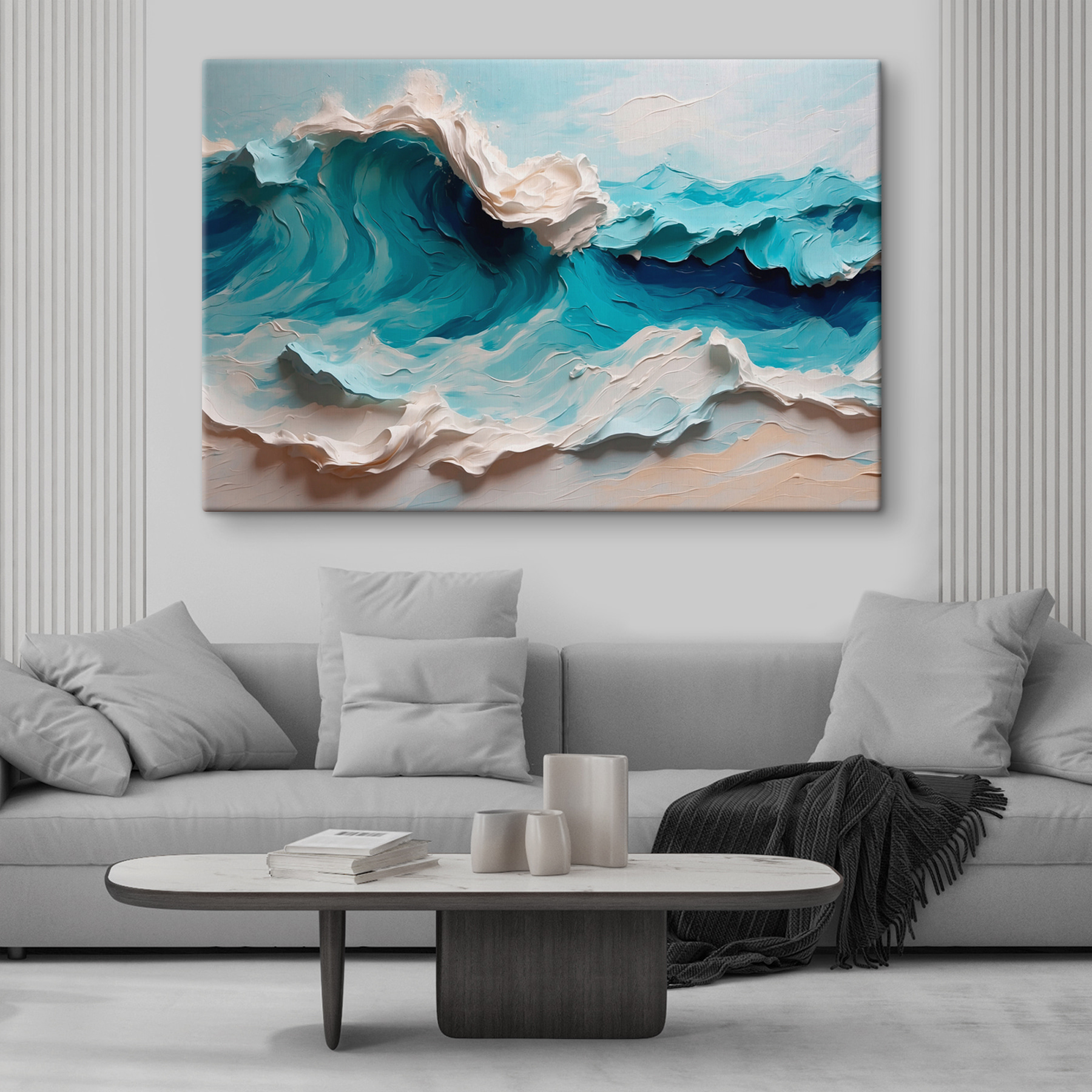Tauchen Sie ein in das heitere Chaos von “Wandbilder Painting of a Wave”! Kennst du das Gefühl, wenn die Meeresbrise dir Freiheit einflüstert? Das ist es, was dieses Bild vermittelt. Die leuchtenden Blautöne und das wirbelnde Weiß fangen die Seele des Meeres ein – wild und doch beruhigend. Es ist, als hätte man den Ozean direkt vor der Nase, ohne nasse Füße zu bekommen. Perfekt, um einen Hauch von Naturschauspiel in Ihren Raum zu bringen. Stellen Sie sich vor, Sie nippen an Ihrem Kaffee und beobachten, wie diese Welle über Ihre Wand plätschert. Es ist nicht nur Kunst, es ist eine Flucht. Da bekommt man doch gleich Lust zu surfen, oder?