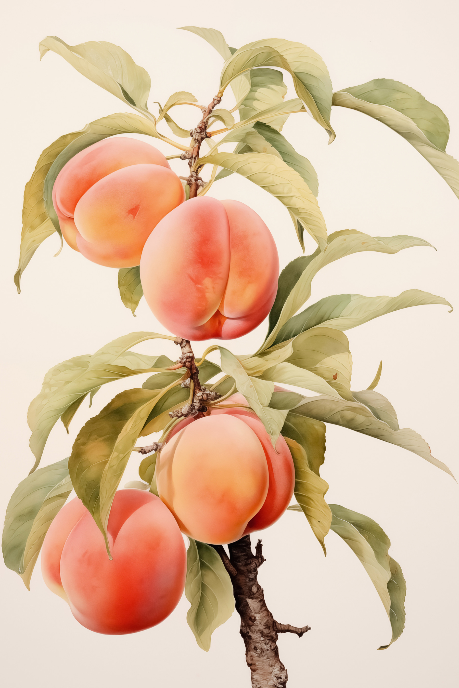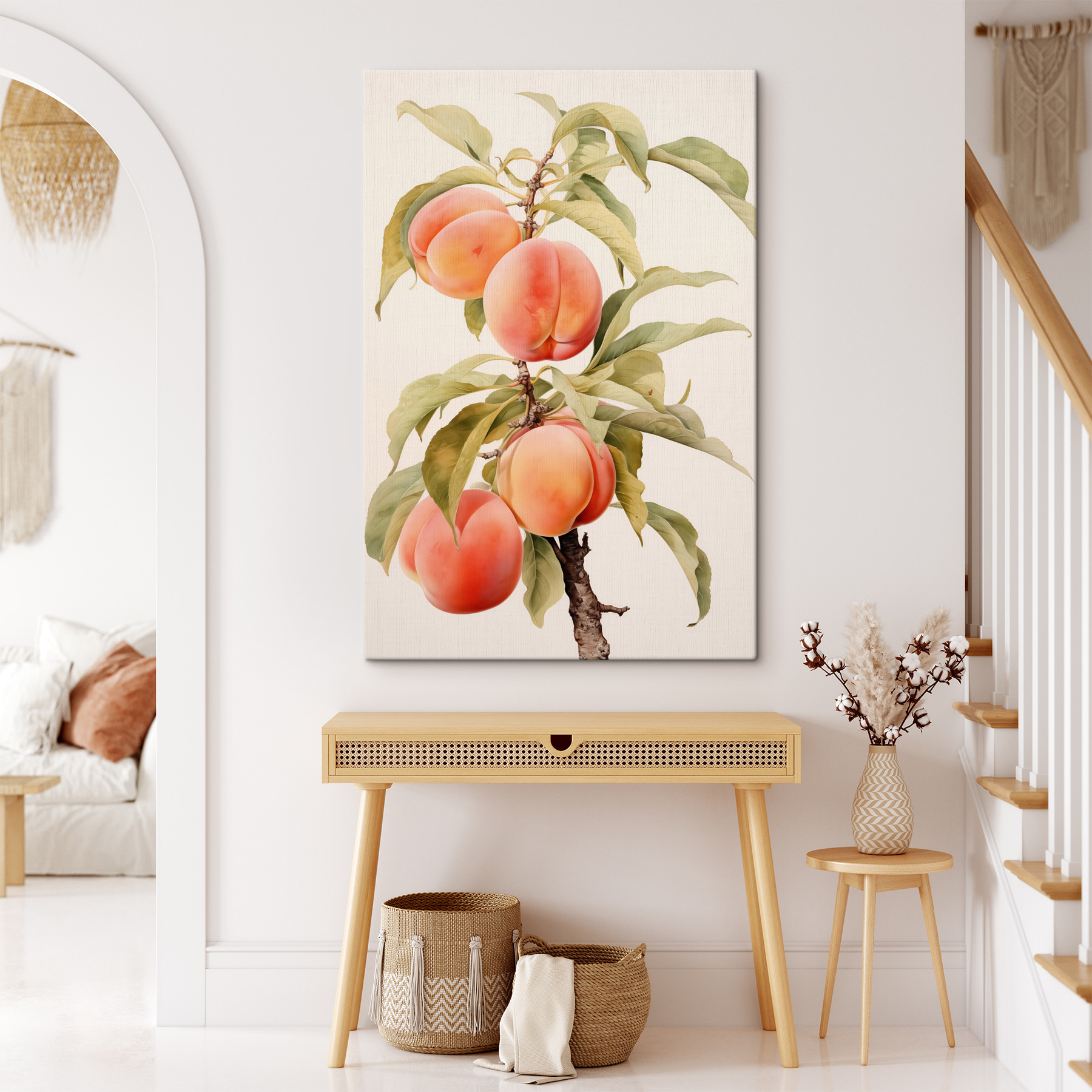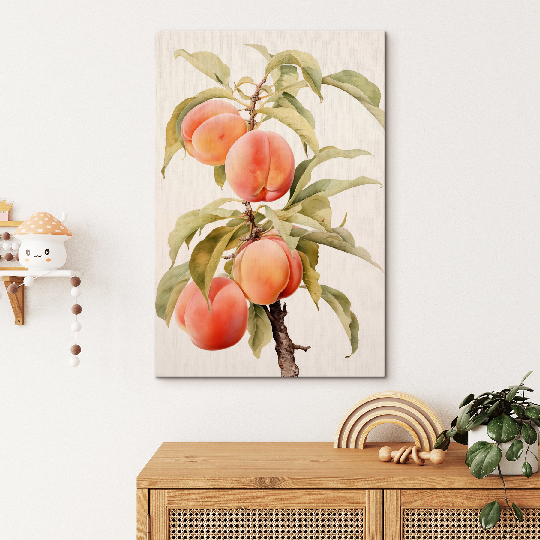 Stellen Sie sich vor: ein Pfirsichbaumzweig, der vor saftigem Leben nur so strotzt, direkt an Ihrer Wand. Dieser Leinwanddruck ist ein kleines Stückchen vom Dessertteller der Natur – süß, lebendig und ewig reif. Perfekt für Küchenwände oder jeden Ort, der einen Spritzer sonniger Wärme braucht. Stellen Sie sich vor, ein Gast sieht diese entzückende Szene und spürt sofort den Charme eines warmen Sommertages. Vielleicht riechen sie sogar Pfirsiche (oder haben einfach nur Lust auf einen)! Dieses Bild ist erfrischend und eine freche Anspielung auf die schönen Dinge des Lebens.