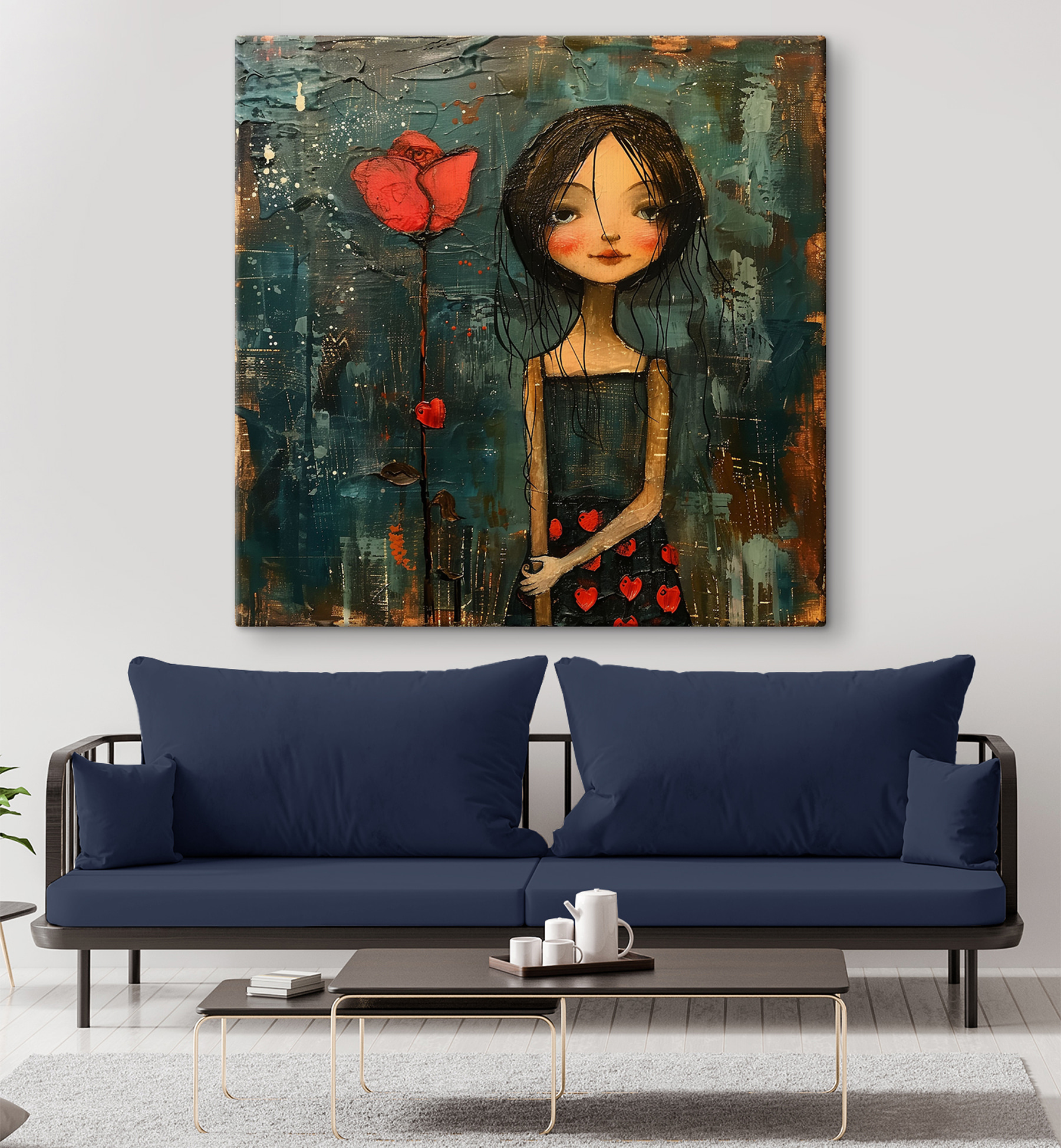 Stellen Sie sich vor, Sie kommen nach einem langen Tag nach Hause und sehnen sich nach einer gemütlichen Ecke zum Entspannen. Dieses wundervolle Leinwandbild könnte genau das Richtige sein! Das verträumte Gemälde eines Mädchens, das eine Blume hält, ist sanft und magisch, als würde man in ein Märchen eintauchen. Die leuchtenden Farben – die tiefen Blautöne und das kräftige Rot – verleihen jedem Raum das Gefühl, ein Herz zu haben. Es ist perfekt für alle, die Kunst mit einem Hauch von Laune lieben. Stellen Sie es sich einfach über Ihrer Leseecke vor und verleihen Sie ihm einen Hauch von Charme und eine Menge Wärme.