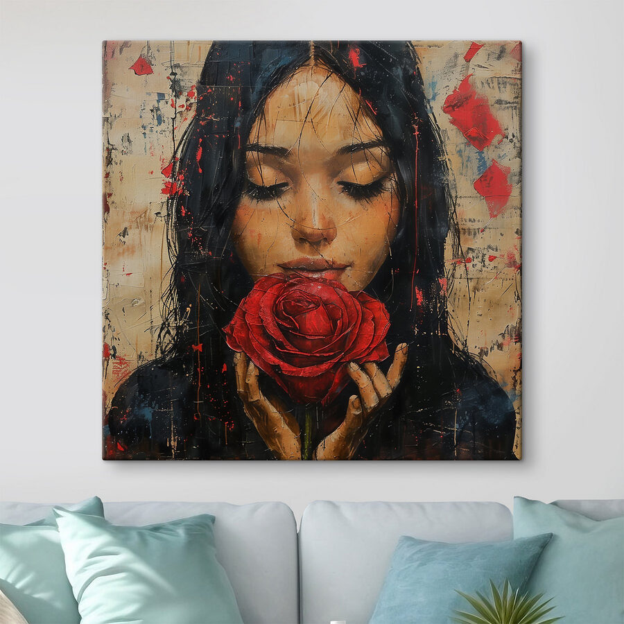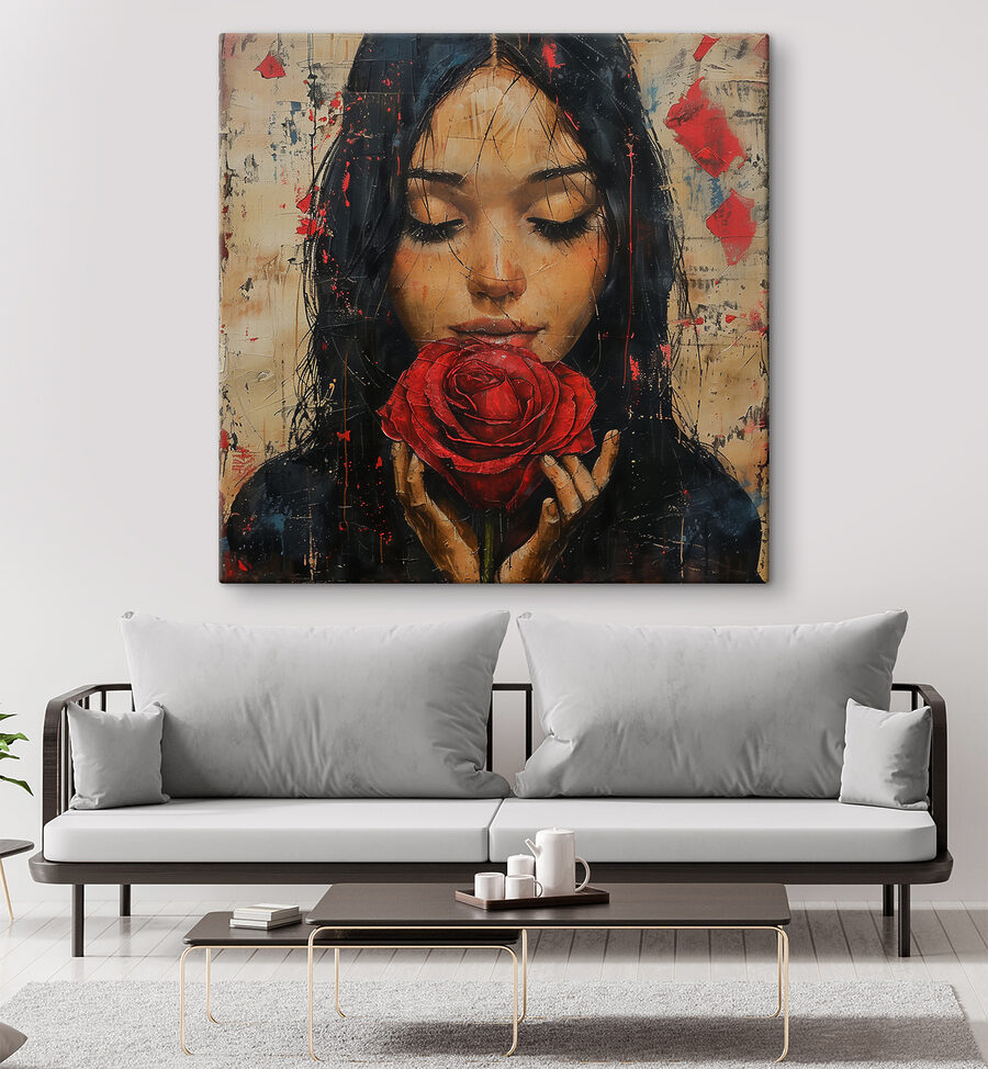 Hier ist eine Leinwand, die geradezu nach Eleganz schreit. Es ist ein Gemälde einer Frau, die liebevoll eine rote Rose umklammert. Stellen Sie sich das Bild in Ihrem Wohnzimmer vor – vielleicht bleiben Ihre Freunde mitten im Satz stehen, weil sie von seiner Anziehungskraft fasziniert sind. So wie das tiefe Rot der Rose hervorsticht, ist es, als würde die Blume direkt auf der Leinwand erblühen. Perfekt für alle, die Kunst lieben, die eine Geschichte erzählt und das Geheimnis der Menschen mit der zeitlosen Schönheit der Blumen verbindet. Jedes Mal, wenn Sie es betrachten, könnte es süße Tagträume auslösen und Sie in seine ruhige, blumige Welt entführen.