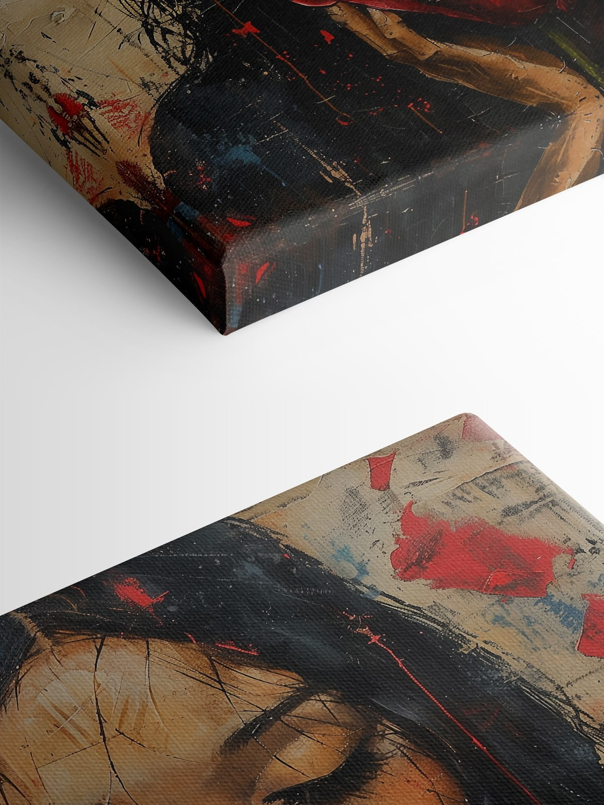 Hier ist eine Leinwand, die geradezu nach Eleganz schreit. Es ist ein Gemälde einer Frau, die liebevoll eine rote Rose umklammert. Stellen Sie sich das Bild in Ihrem Wohnzimmer vor – vielleicht bleiben Ihre Freunde mitten im Satz stehen, weil sie von seiner Anziehungskraft fasziniert sind. So wie das tiefe Rot der Rose hervorsticht, ist es, als würde die Blume direkt auf der Leinwand erblühen. Perfekt für alle, die Kunst lieben, die eine Geschichte erzählt und das Geheimnis der Menschen mit der zeitlosen Schönheit der Blumen verbindet. Jedes Mal, wenn Sie es betrachten, könnte es süße Tagträume auslösen und Sie in seine ruhige, blumige Welt entführen.