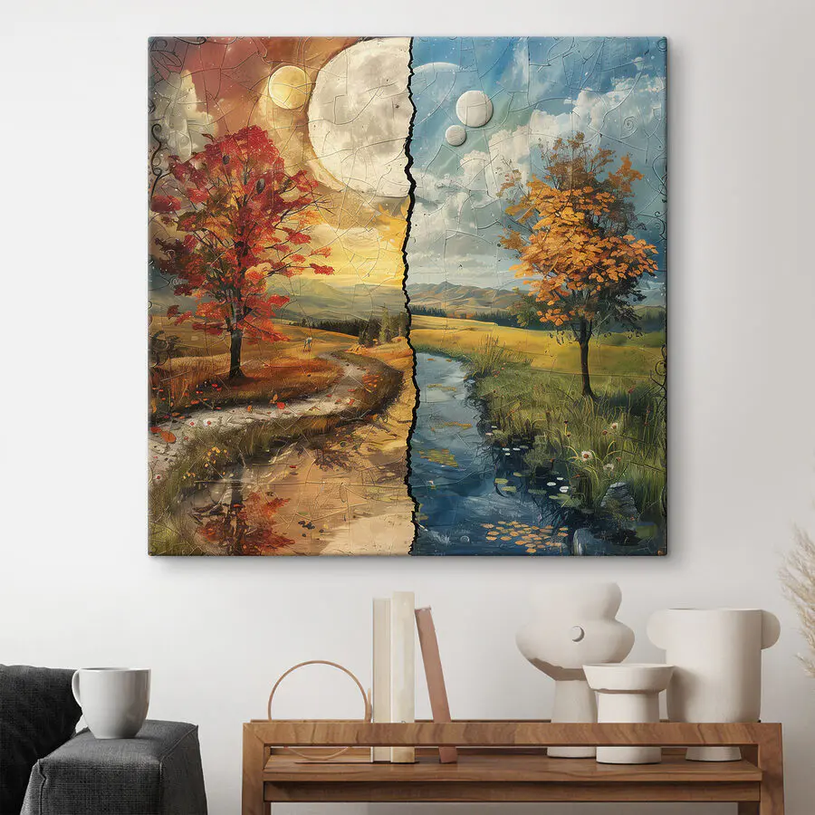 Sehen Sie sich “Wandbilder Puzzle of a Landscape with Trees and a River” an – ein Werk, das Sie einlädt, in seine Geschichte einzutauchen. Wie ein Kunstpuzzle für Ihre Wände! Stellen Sie sich vor, Sie schlürfen einen Kaffee und bewundern, wie das Bild einen gemütlichen Nachmittagsspaziergang an einem rauschenden Fluss festhält. Die Bäume tanzen im Wind, die Farben vermischen sich wie eine Aquarellpalette der Natur. Es ist, als ob man sich die Welt draußen ins Wohnzimmer holt, nur ohne die Ungeziefer. Perfekt, um kreative Gedanken zu wecken oder einfach nur zu träumen. Spüren Sie schon diese gemütliche Stimmung?