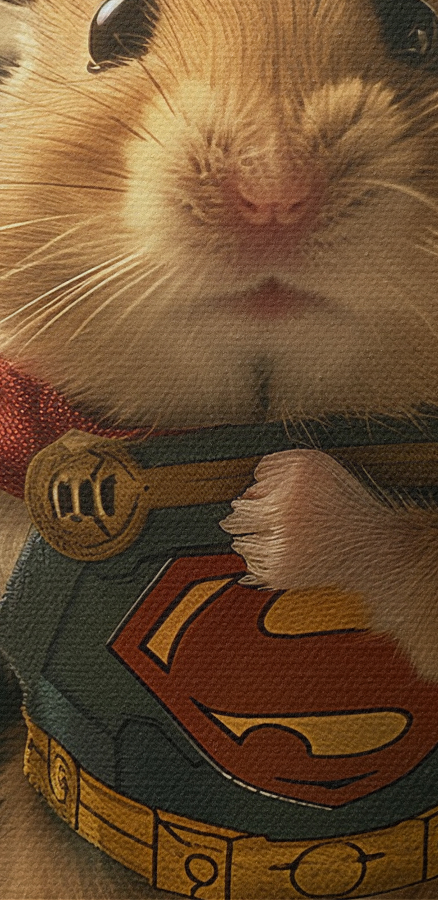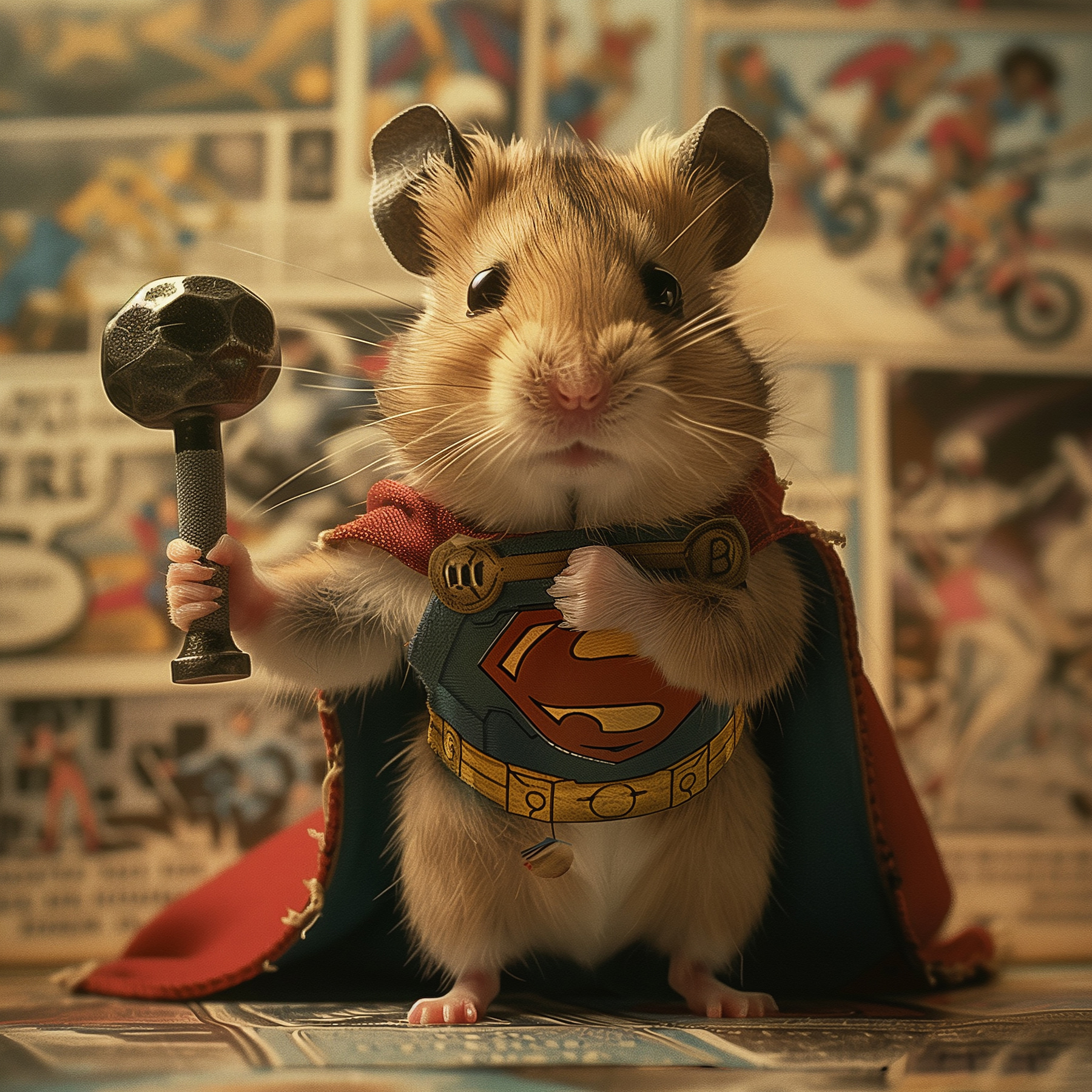 Hast du dich jemals gefragt, wie ein kleiner Held aussieht? Hier ist dieser Leinwanddruck eines niedlichen Hamsters mit einem Umhang und einem Hammer in der Hand. Es ist die Art von Kunst, die dich jedes Mal zum Lächeln bringt, wenn du es ansiehst. Stellen Sie sich das Bild an Ihrer Wand vor, um Ihren Tag mit einem Hauch von Laune zu bereichern. Perfekt für jeden Tierliebhaber oder Superhelden-Fan. Dieser kleine Kerl könnte Ihren inneren Helden inspirieren oder zumindest zum Schmunzeln bringen. Es ist die Art von lustiger und skurriler Dekoration, die ein Haus wie ein Zuhause fühlen lässt. Liebenswert, unerwartet – wie ein Ausbruch von Freude!