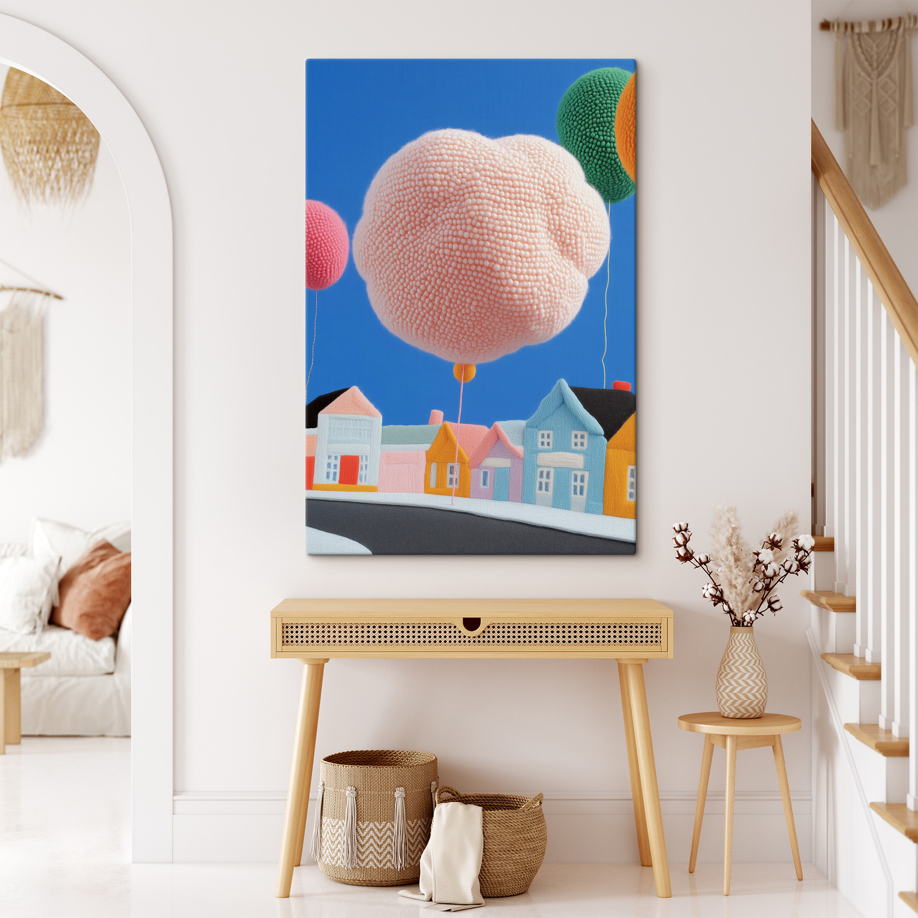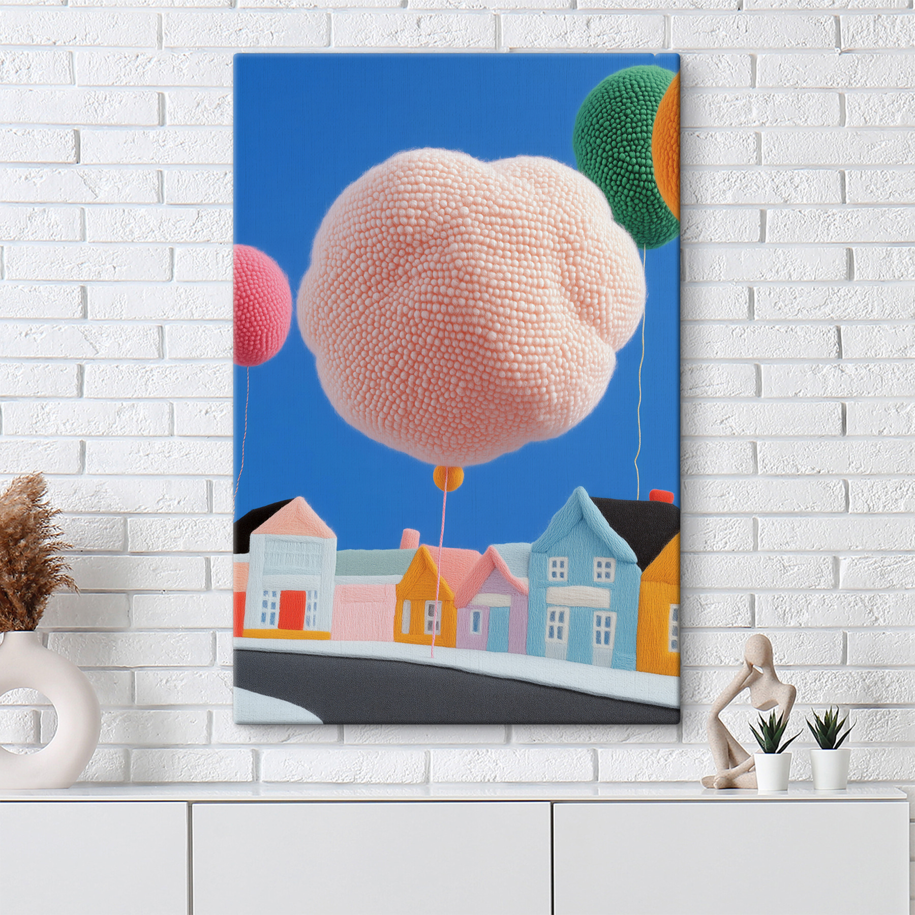 Stellen Sie sich das vor: Ein bunter Schwall skurriler Luftballons, die sanft über einer charmanten Nachbarschaft schweben. Dieser Leinwanddruck “Ballongruppe in der Luft” ist wie ein fröhlicher kleiner Tagtraum an Ihrer Wand. Die Farben sind so einladend, dass sie Ihre Laune genauso heben könnten wie diese wunderlichen Ballons. Perfekt für alle, die einen Hauch von Freude in ihrer Einrichtung lieben. Es ist die Art von Kunst, die Sie zum Lächeln bringt und an sorglose Momente denken lässt – wie eine sanfte Brise an einem sonnigen Tag. Ein toller Gesprächsanlass. Holen Sie sich ein bisschen Magie nach Hause!