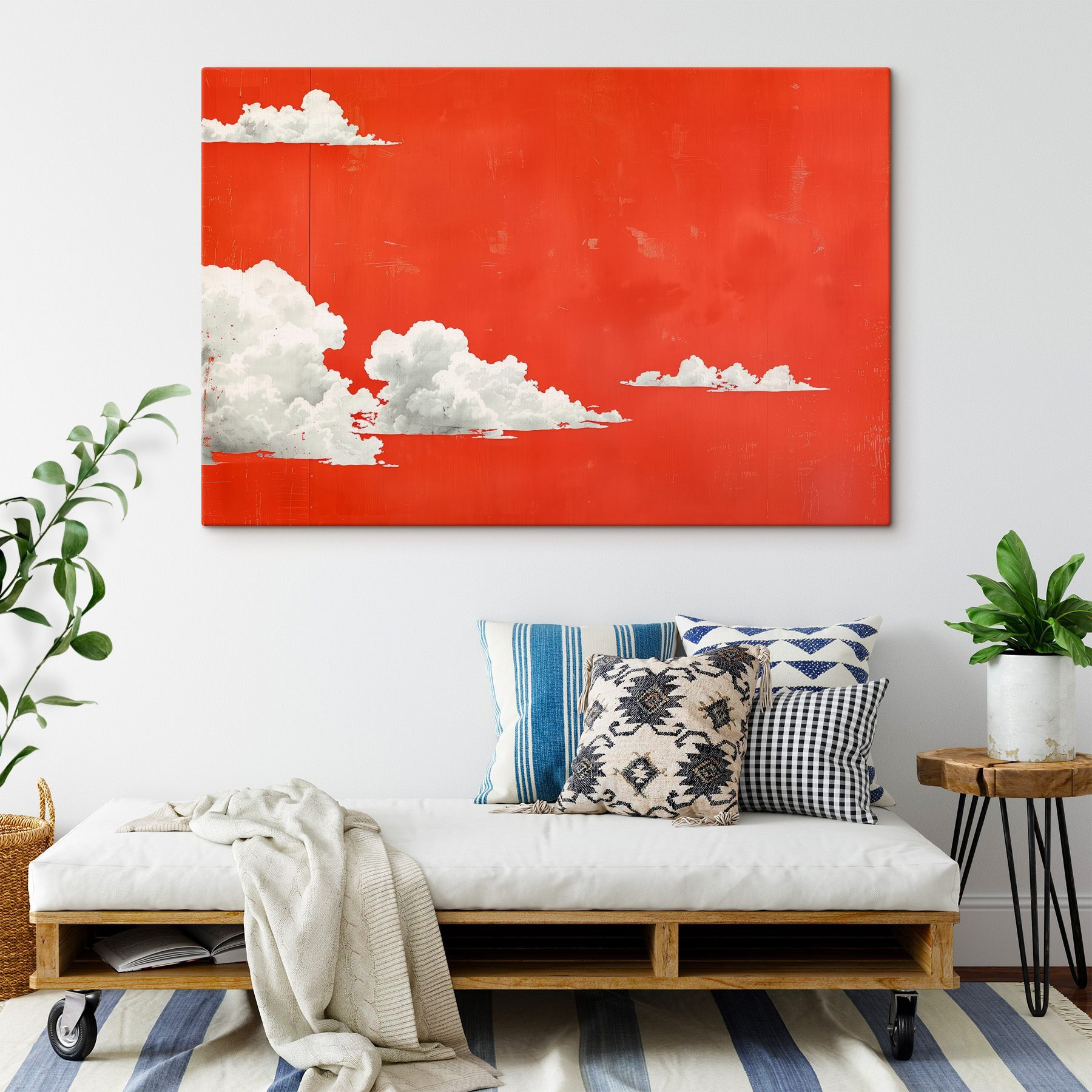 Hatten Sie jemals das Gefühl, dass Wolkenbeobachtung ein Indoor-Sport sein sollte? “White Clouds on a Red Background” bringt diese entspannte Sonntagsstimmung direkt in Ihren Raum. Mit seinem satten Rotton – vielleicht eine Anspielung auf die Leidenschaft? – lässt es die weißen Wolken wie verspielte Zuckerwatte erscheinen. Dieses minimalistische Wunderwerk ist mehr als nur ein Blickfang: Es schafft eine Atmosphäre. Stellen Sie sich vor, Sie versinken in einem guten Buch oder schlürfen einfach einen Tee unter diesem himmlischen Anblick. Ein Hauch von Skurrilität an der Wand – ganz ohne Wetterkapriolen!
