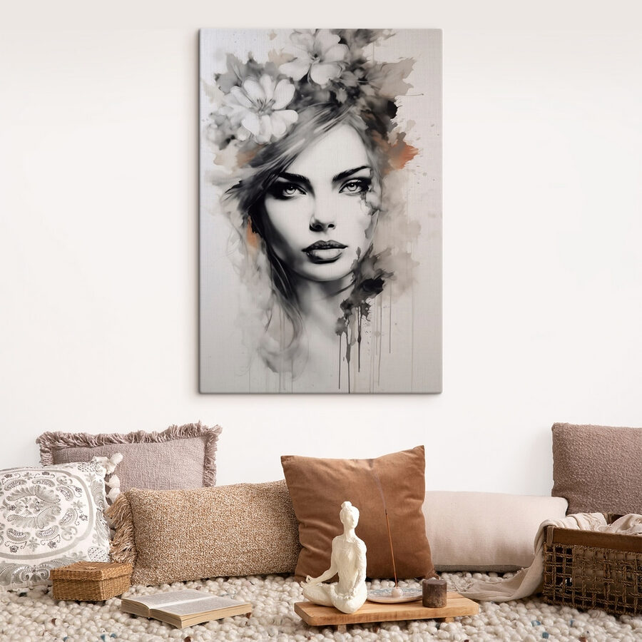 Stellen Sie sich das vor: ein auffälliges Stück, das Eleganz mit einem Hauch von Geheimnis verströmt. Das Bild einer blütengekrönten Frau ist in sanften Schwarz- und Weißtönen gehalten. Es ist, als ob sie Sie direkt anschaut und Sie in ihre ruhige und doch faszinierende Welt hineinzieht. Perfekt für alle, die Geschichten und Emotionen in Kunst verweben wollen. Stellen Sie es sich an Ihrer Wand vor – vielleicht verschönert es Ihre gemütliche Leseecke oder verleiht Ihrem Wohnzimmer Charme. Es ist ein Gesprächsanlass, ein Stimmungsmacher. Absolut zeitlos, mit einem Hauch von Laune.