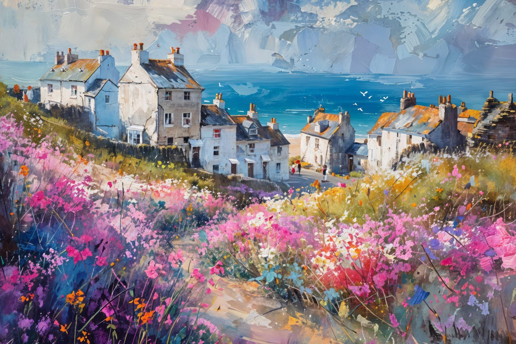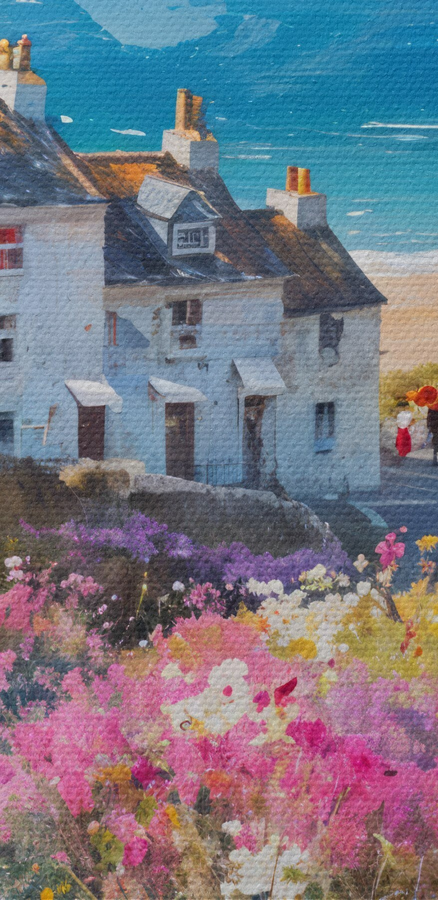 Stellen Sie sich vor, Sie betreten ein lebendiges kleines Dorf, in dem die Blumen in so leuchtenden Farben blühen, dass man schwören könnte, der Sommer sei ewig. Dieser Leinwanddruck fängt diesen Zauber ein, wie die Luft nach frischen Blüten und alten Geschichten riecht. In der Ferne flüstert das Meer und deutet unvorhergesehene Abenteuer an. Hängen Sie dieses Bild in Ihrem Raum auf, und plötzlich hat Ihr Wohnzimmer den gemütlichen Charme einer alten Welt am Meer. Es ist wie ein Mini-Urlaub, nur ohne die unangenehmen Sandalen und den Sonnenbrand. Ideal für Träumer und Wanderer gleichermaßen!