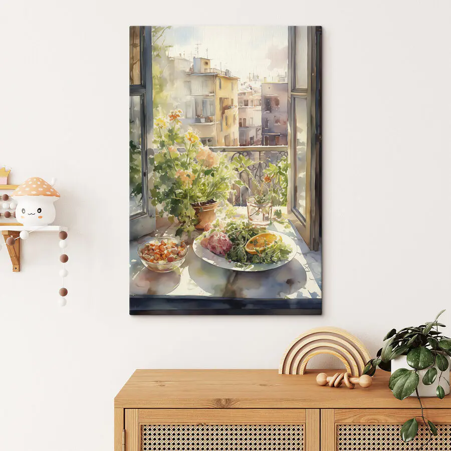 Stellen Sie sich Folgendes vor: Sie betreten einen Raum, und da ist es – ein lebhaftes Aquarell, das wie ein frischer Wind weht. Ein sonniger Tisch, gedeckt mit köstlichen Speisen und leuchtenden Blumen, die von einem gemütlichen Vormittag künden. Aus dem Fenster blickt man auf charmante Dächer, die im Sonnenlicht liegen und zum Verweilen einladen. Eine schöne Flucht direkt an Ihrer Wand. Perfekt für alle, die von einem Morgen träumen, der mit einem langsamen Frühstück und warmem Tageslicht gefüllt ist. Bringen Sie es in Ihren Raum und lassen Sie es die Show stehlen.