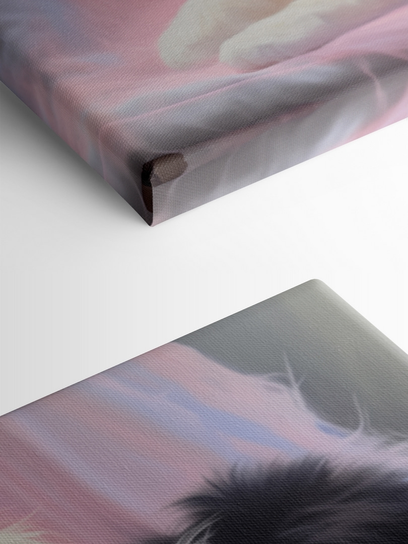 Dieser charmante Leinwanddruck einer schwarz-weißen Katze, die sich auf einer flauschigen rosa Decke räkelt, ist eine wahre Freude. Stellen Sie sich vor, wie dieser Katzenfreund mit seinen großen, neugierigen Augen ruhig Ihr tägliches Treiben beobachtet. Das Bild strahlt eine gemütliche, verspielte Atmosphäre aus, die jeden Raum sofort erhellt. Perfekt für die Ecke eines Katzenliebhabers oder ein Kinderzimmer – vielleicht lockt es sogar ein paar Spielzeugmäuse zum Spielen heraus! Die sanften Farben und raffinierten Details schaffen eine warme Atmosphäre, die zum Kuscheln und Verweilen einlädt. Es ist, als hätte man ein kleines Stück friedlicher Gelassenheit direkt an der Wand!