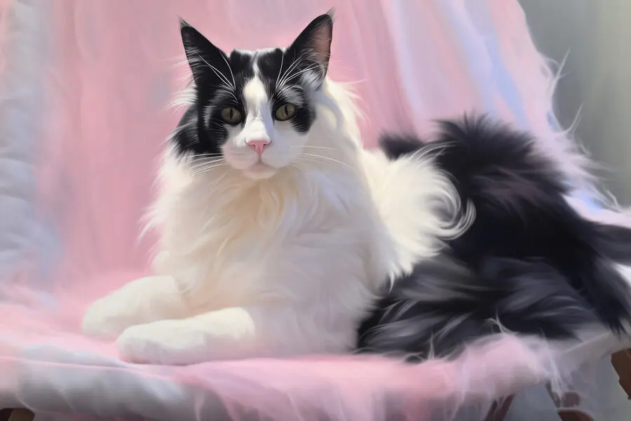 Dieser charmante Leinwanddruck einer schwarz-weißen Katze, die sich auf einer flauschigen rosa Decke räkelt, ist eine wahre Freude. Stellen Sie sich vor, wie dieser Katzenfreund mit seinen großen, neugierigen Augen ruhig Ihr tägliches Treiben beobachtet. Das Bild strahlt eine gemütliche, verspielte Atmosphäre aus, die jeden Raum sofort erhellt. Perfekt für die Ecke eines Katzenliebhabers oder ein Kinderzimmer – vielleicht lockt es sogar ein paar Spielzeugmäuse zum Spielen heraus! Die sanften Farben und raffinierten Details schaffen eine warme Atmosphäre, die zum Kuscheln und Verweilen einlädt. Es ist, als hätte man ein kleines Stück friedlicher Gelassenheit direkt an der Wand!