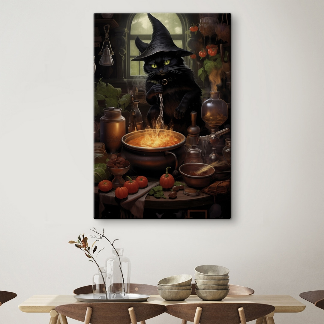 Machen Sie sich bereit, Ihren Raum mit diesem skurrilen Leinwanddruck aufzupeppen, der eine Katze mit einem Zaubererhut zeigt, die in einem mystischen Topf mit blubbernden Leckereien rührt! Es ist wie ein Stück Laune direkt aus einem Märchenbuch. Dieses Kunstwerk ist perfekt für alle, die einzigartige Dekorationen lieben. Es strahlt Wärme und eine Prise Humor aus, so als ob die schelmische Katze Sie einladen würde, beim Kochen mitzumachen. Stellen Sie es sich in einer gemütlichen Küche oder in einer verspielten Ecke vor; es wird mit Sicherheit für Gesprächsstoff sorgen. Ganz gleich, ob Sie ein Katzenliebhaber sind oder einfach nur clevere Kunst zu schätzen wissen, dieses Stück wird Ihnen jedes Mal ein Lächeln entlocken, wenn Sie daran vorbeigehen. Es ist die Art von Charme, die eine gewöhnliche Wand in etwas Magisches verwandelt!